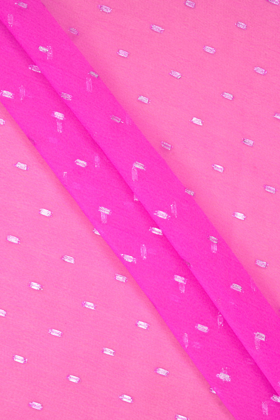Itališkas poliesterio šifonas karštos rožinės spalvos su mažų, geometrinių raštų motyvu, pagamintu iš sidabro lurekso siūlų. Audinys yra plonas ir tekantis, todėl puikiai tinka siūti erdvią suknelę, palaidinę ar skara. Fantastiškas pasiūlymas energingų, šiek tiek blizgančių audinių gerbėjams.