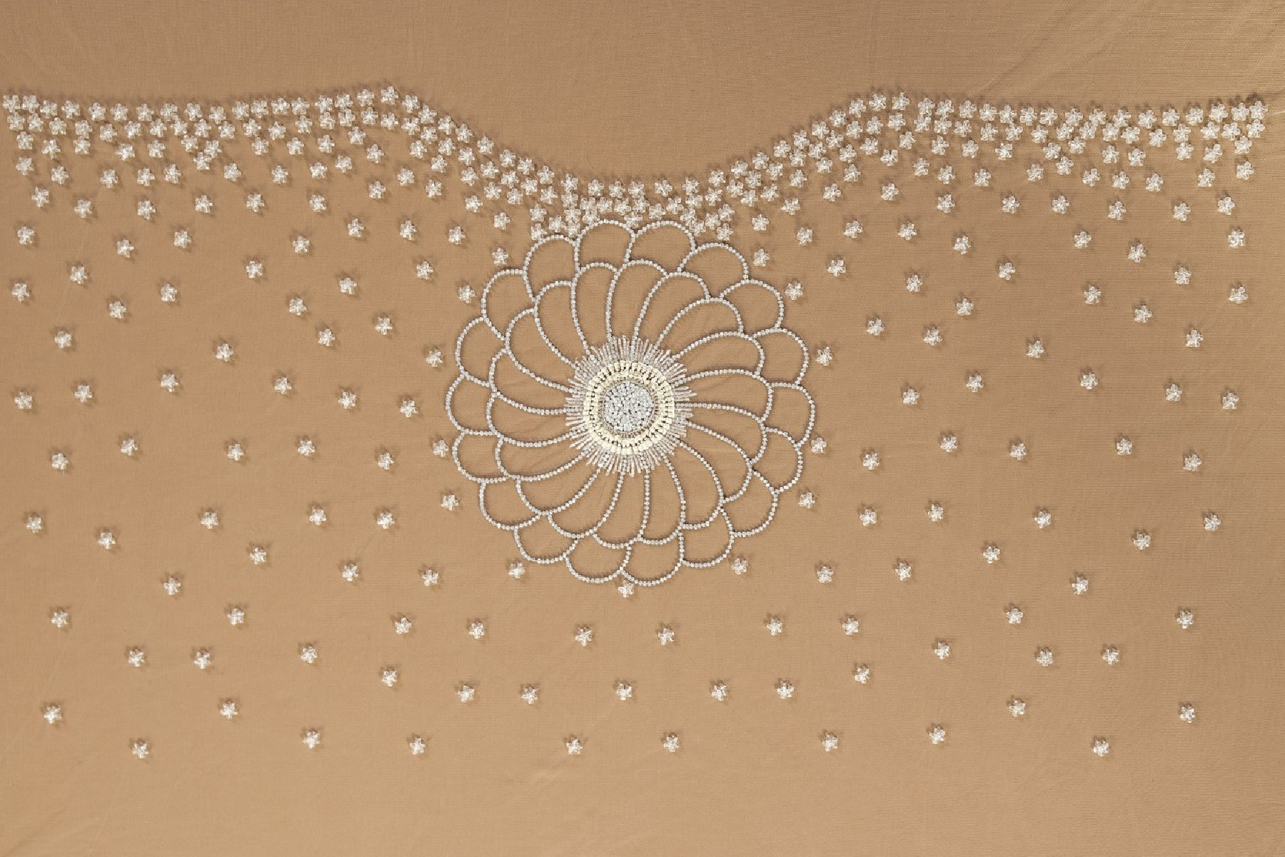 Itališka vestuvių aplikacija korseto pavidalu (palaidinė - priekyje). Ant kreminės spalvos tiulio - aplikacijos viduryje buvo siuvama didelė gėlė (24 cm), pagaminta iš skaidrių karoliukų ir blizgučių - gėlės centras buvo tankiai užpildytas sidabro ir ecru karoliukais bei blizgučiais. Korseto viršus tankiai dekoruotas mažomis, skaidriomis gėlėmis - raštas mažėja žemyn. Aplikacija puikiai tinka vestuvinėms ar vakarinėms suknelėms.