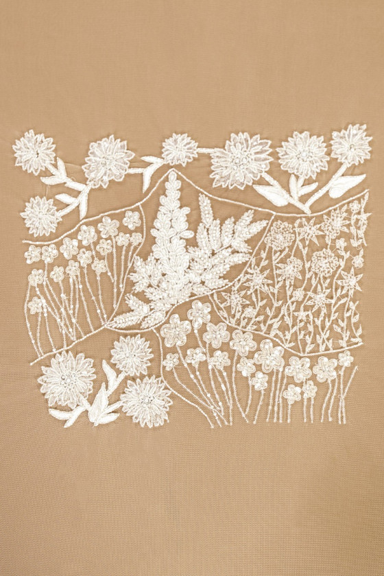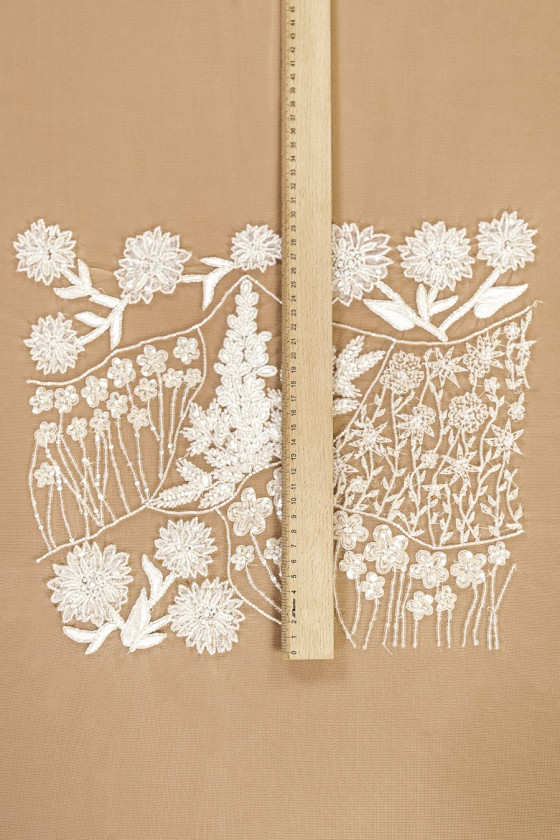 Itališka, didelė ecru vestuvių aplikacija. Įvairių gėlių motyvas, pagamintas iš skaidrių blizgučių ir karoliukų bei siuvinėtų lapų.