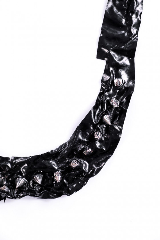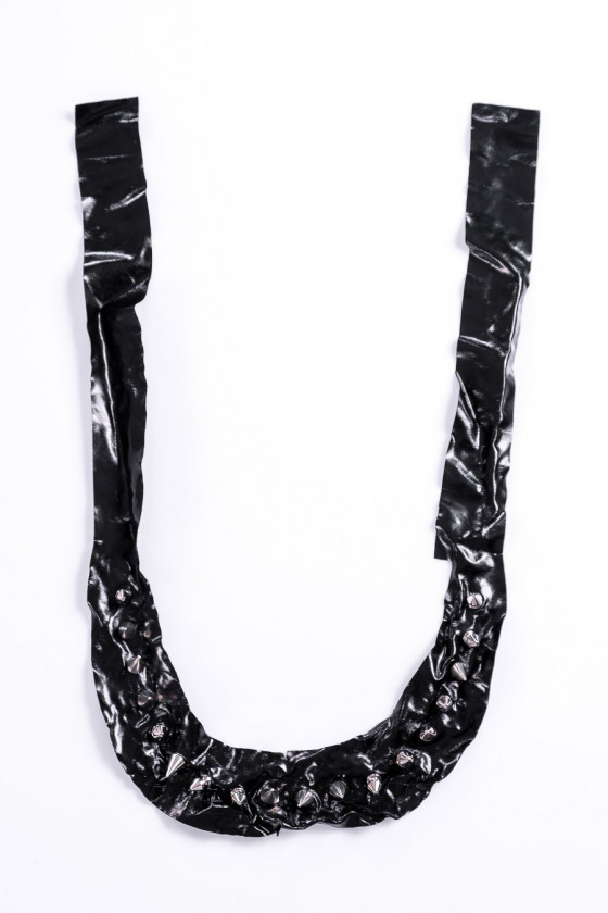 Juodas lateksas su iškirptės formos smeigėmis. Latekso juostos ilgis – 90 cm, smeigių skaičius – 18 vnt. Smeiges galima atsukti.