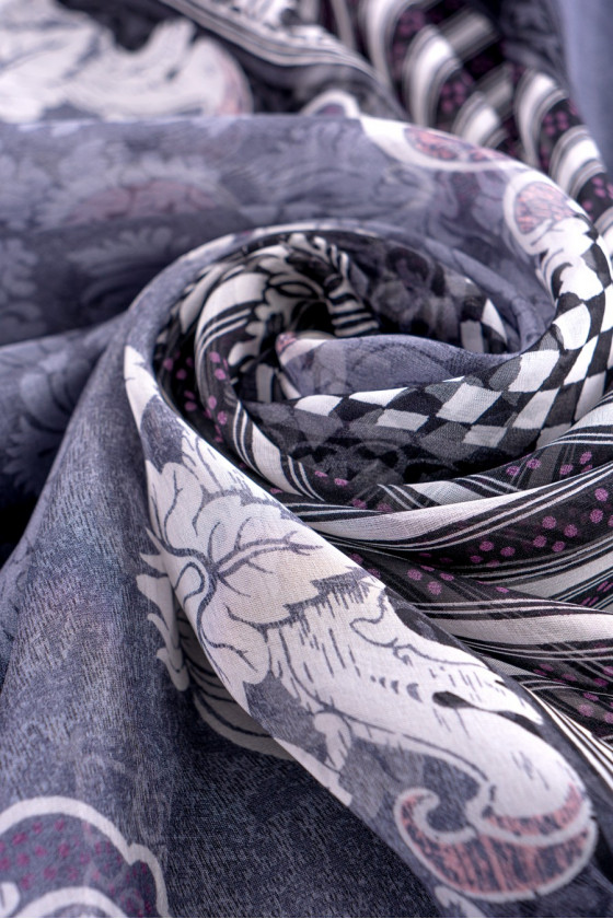 Itališko šilko šifonas įdomiame kupone 135*140 cm. Raštas prasideda 20 cm pločio dekoratyvine juostele, tada virsta pilkos spalvos dekoratyvinės mozaikos modeliu su antikvarinės rožinės spalvos elementais ir balta bei juoda šaškių lenta. Audinys yra šiek tiek skaidrus, labai erdvus.