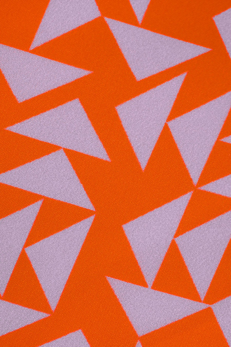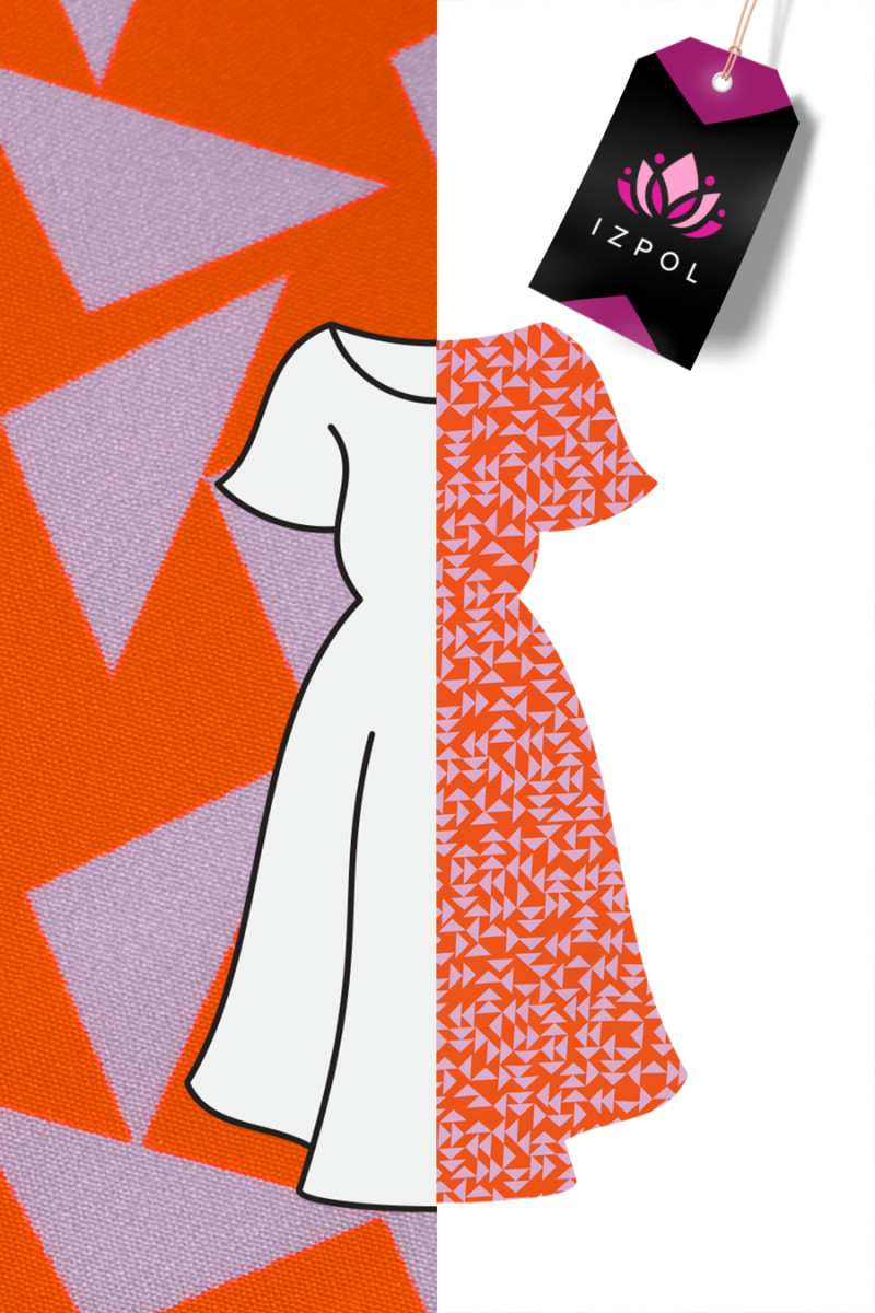 Itališkas šilko krepas - oranžinis su mažais trikampiais purvinos rožinės spalvos. Šilko krepas yra subtilus, plonas, pusiau matinis audinys. Jis gali būti naudojamas erdvioms suknelėms, subtilioms palaidinėms, šalikams, šalikams.