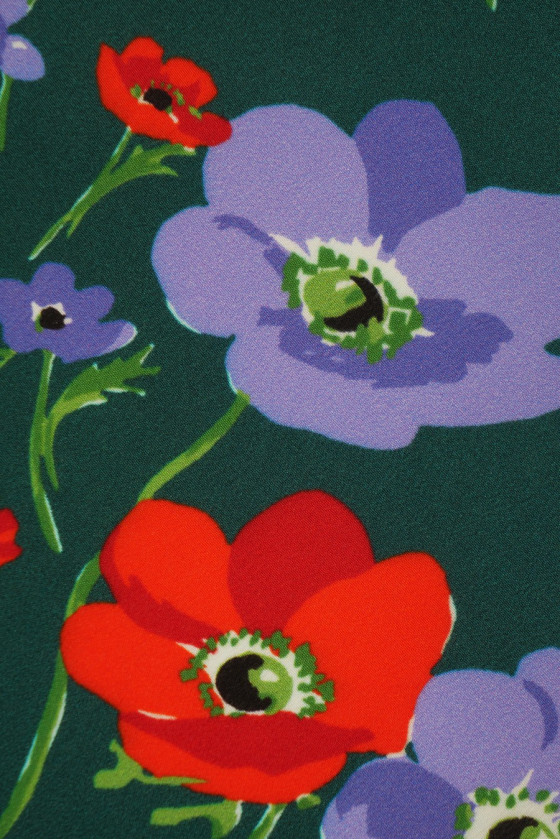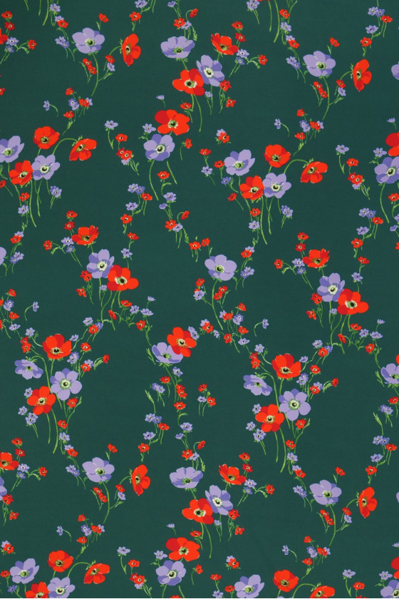Itališkas 100% šilko krepas su gėlių puokščių motyvu spalvomis: oranžinė ir viržių, fone žalio butelio šešėlyje.