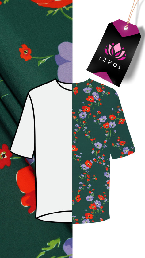 Itališko šilko krepas su gėlių puokščių motyvu oranžine ir viržių spalvomis, žaliame butelio fone. Šilko krepas yra subtilus, plonas, pusiau matinis audinys. Jis gali būti naudojamas erdvioms suknelėms, subtilioms palaidinėms, šalikams, šalikams.