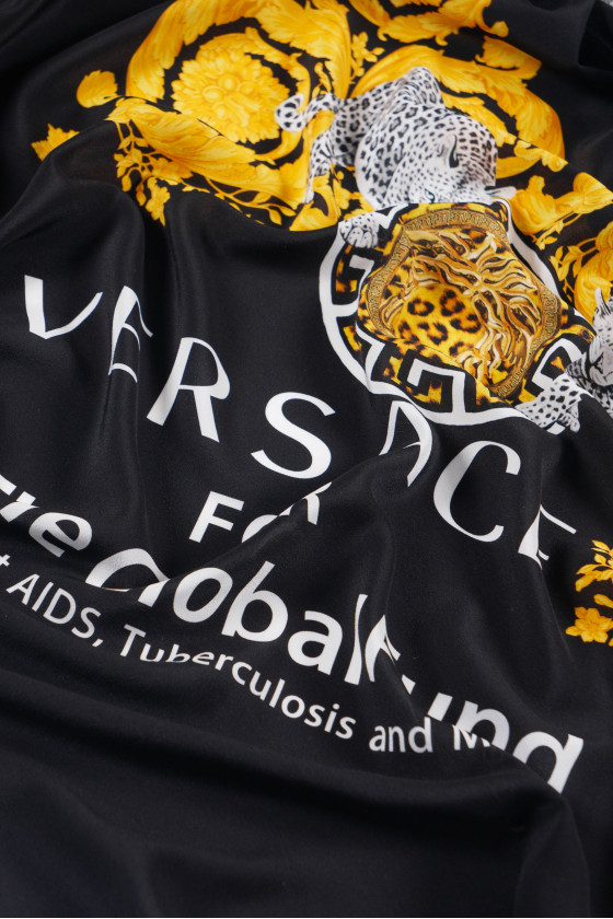 Itališkas 100% šilko krepas, pasirašytas gerai žinomų mados namų pavadinimu. Aukso ir baltos spalvos motyvai juodame fone. Audinys pateikiamas kuponu, kurio matmenys yra 120 cm * 140 cm, kurį sudaro du elementai (priekinė ir galinė, pvz., 85 cm ilgio palaidinės) ir dvi rankovės (34 cm ilgio).