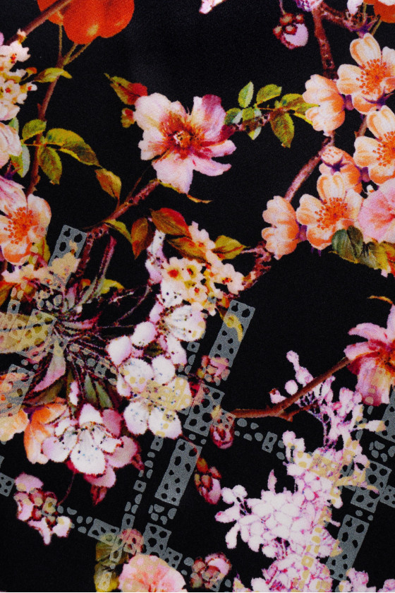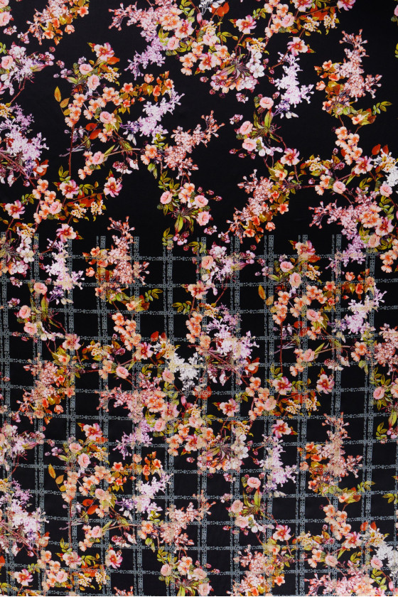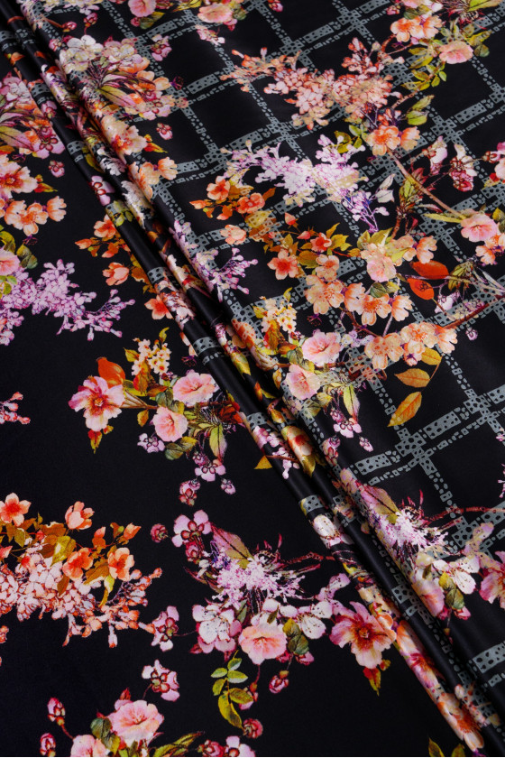 Itališkas 100% šilko satinas 185 cm* 140 cm dydžio kuponu, juodos spalvos su gėlių motyvu, papuoštas pilku čekiu apačioje. Šilko satinas yra subtilus audinys, aksominis liesti, šiek tiek blizgantis. Jis gali būti naudojamas erdvioms suknelėms, subtilioms palaidinėms, šalikams, šalikams.