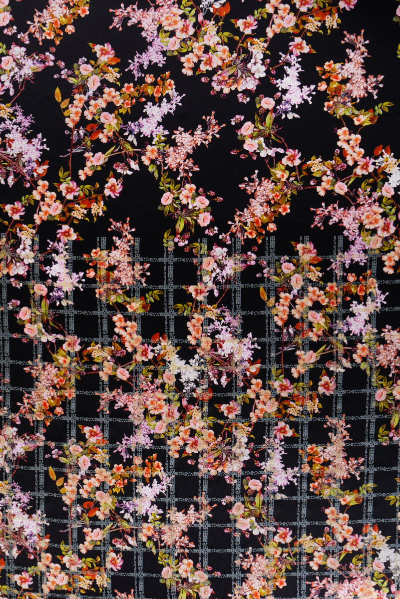 Itališkas 100% šilko satinas 185 cm* 140 cm dydžio kuponu, juodos spalvos su gėlių motyvu, papuoštas pilku čekiu apačioje.