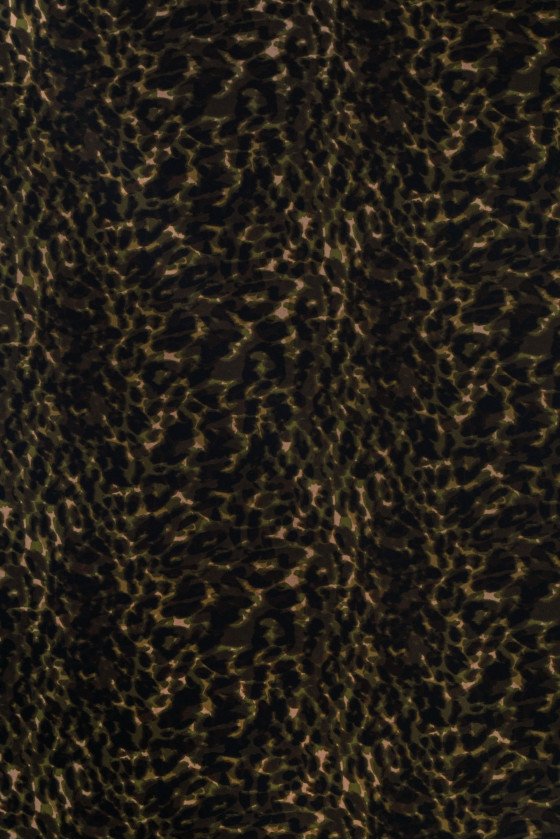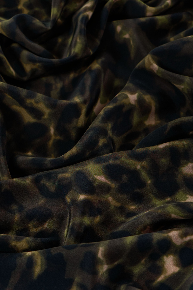 Itališkas 100% šilko krepas su įdomiu kamufliažiniu raštu juodos ir alyvuogių žalios spalvos.