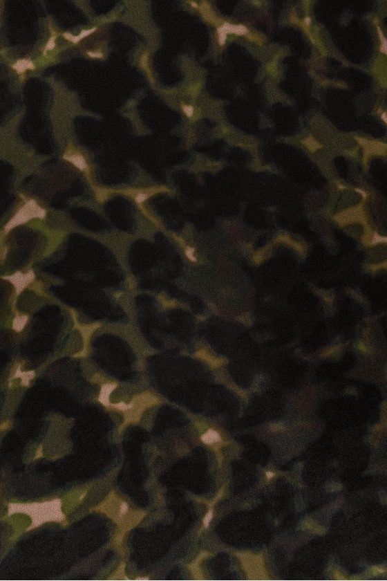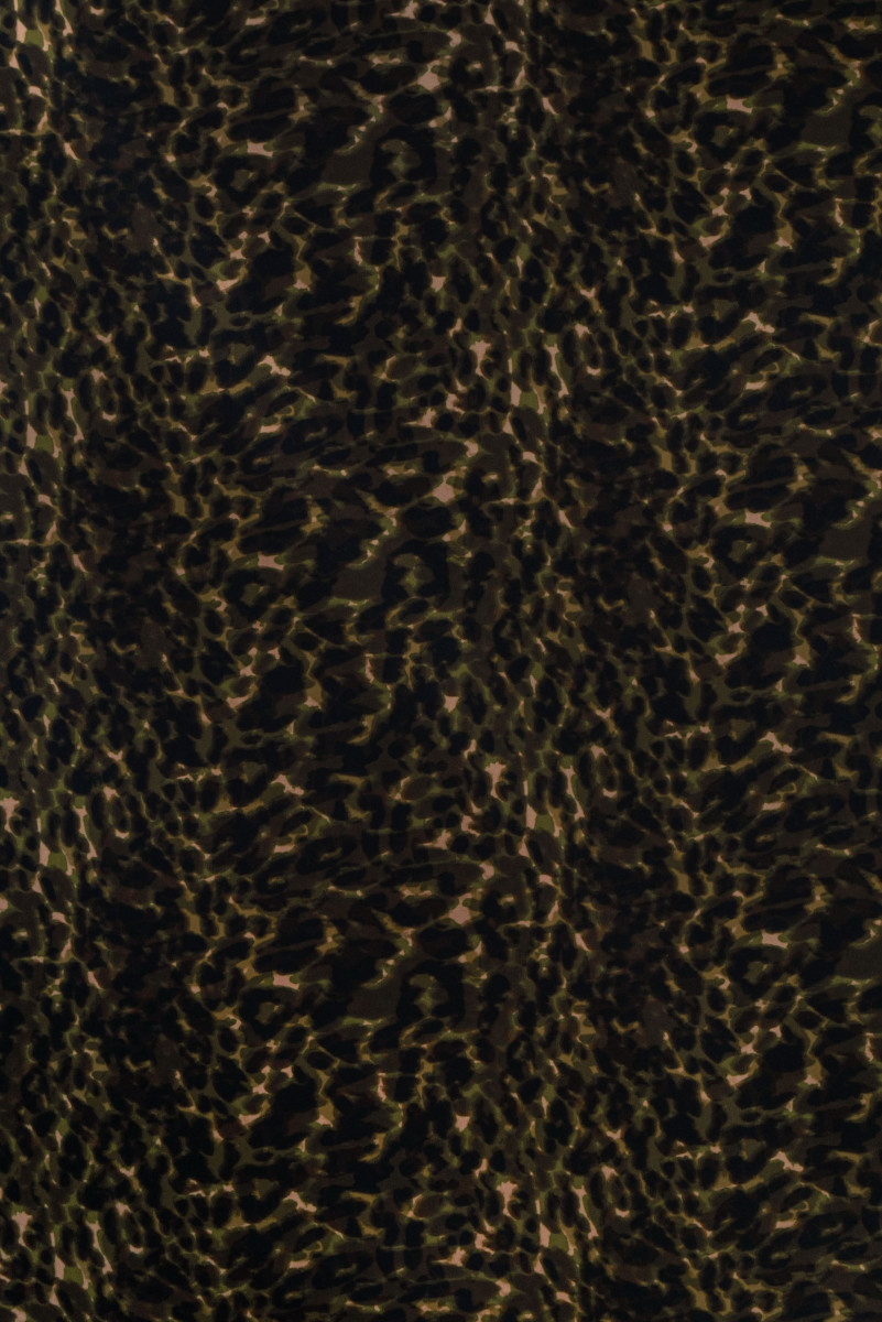 Itališkas 100% šilko krepas su įdomiu kamufliažiniu raštu juodos ir alyvuogių žalios spalvos. Šilko krepas yra subtilus, plonas, pusiau matinis audinys. Jis gali būti naudojamas erdvioms suknelėms, subtilioms palaidinėms, šalikams, šalikams.