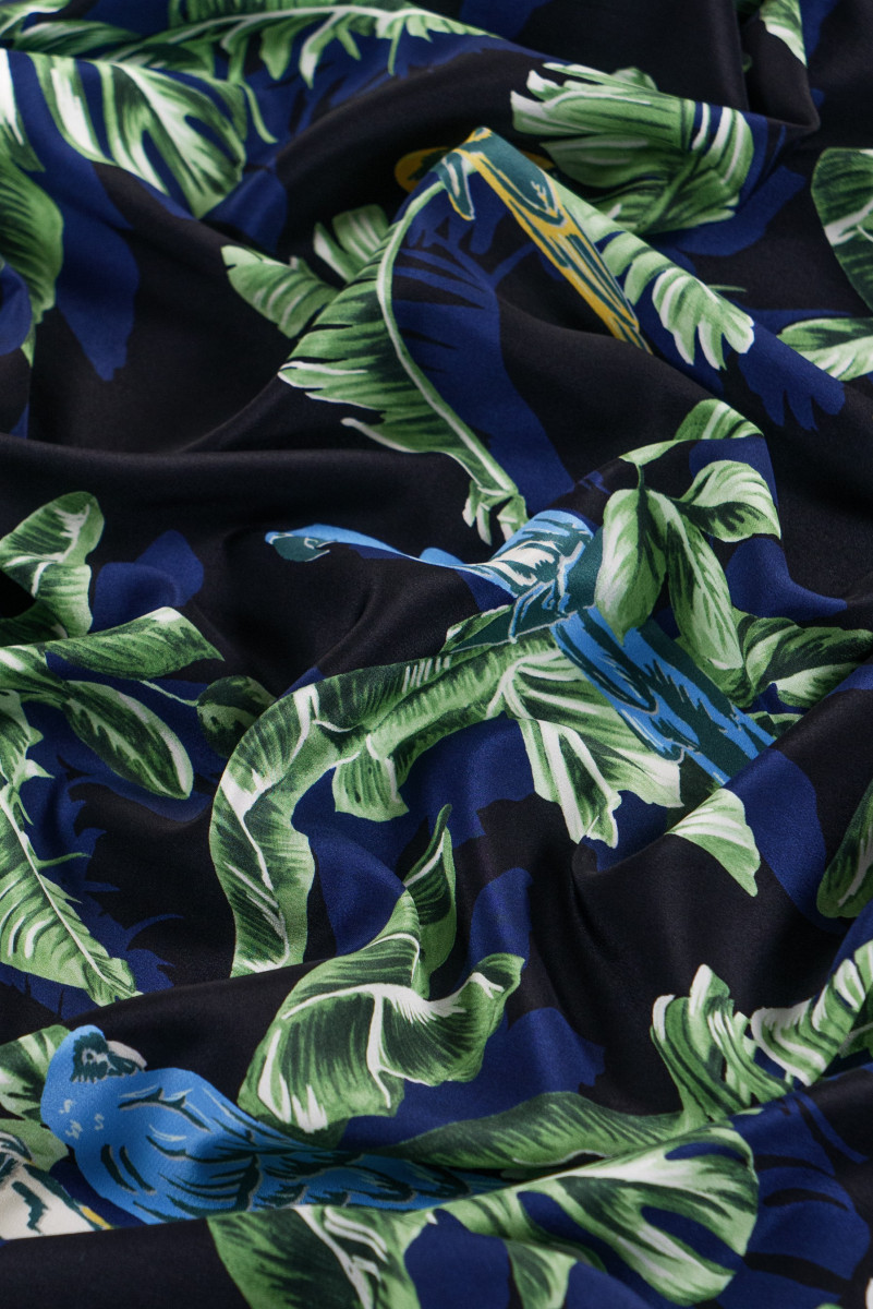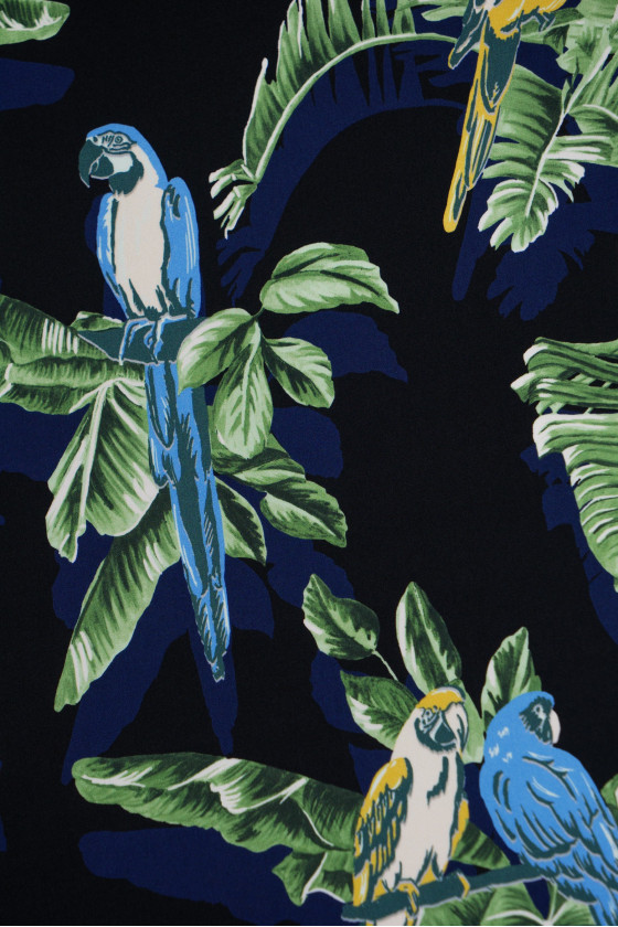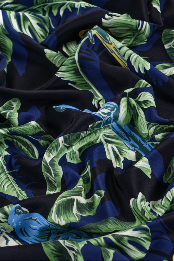 Itališkas 100% šilko krepas juodos spalvos su žalios ir tamsiai mėlynos spalvos lapų ir papūgos motyvu geltonos ir mėlynos spalvos. Šilko krepas yra subtilus, plonas, pusiau matinis audinys. Jis gali būti naudojamas erdvioms suknelėms, subtilioms palaidinėms, šalikams, šalikams.