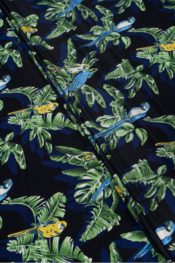 Itališkas krepas 100% juodos spalvos šilkas su žalių ir tamsiai mėlynų lapų motyvu bei geltonos ir mėlynos spalvos papūgomis.