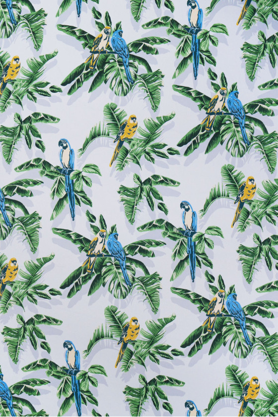 Itališkas krepas 100% šilkas, šviesiai pilkos spalvos su lapų ir mėlynų bei geltonų papūgų motyvu. Šilko krepas yra subtilus, plonas, pusiau matinis audinys.