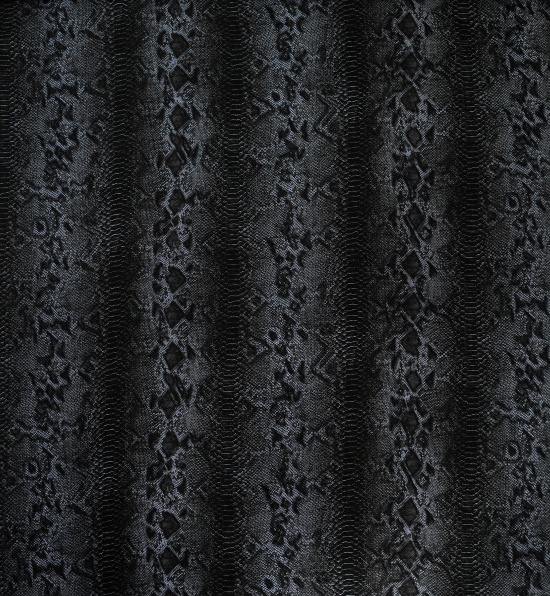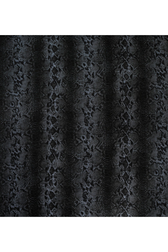 Itališkas satinas 100% šilkas su gyvatės odos motyvu pilkos ir juodos spalvos. Šilko satinas yra subtilus audinys, aksominis liesti, šiek tiek blizgantis.