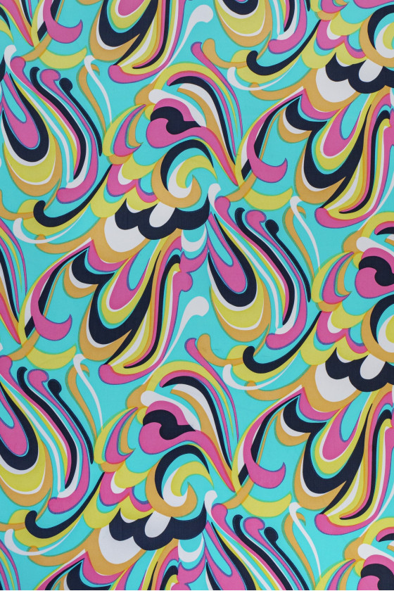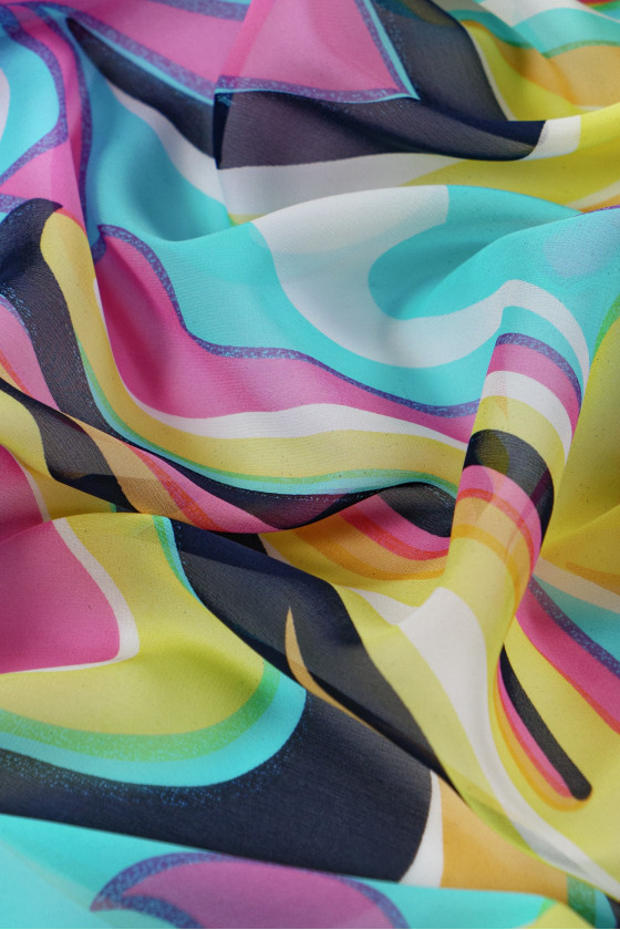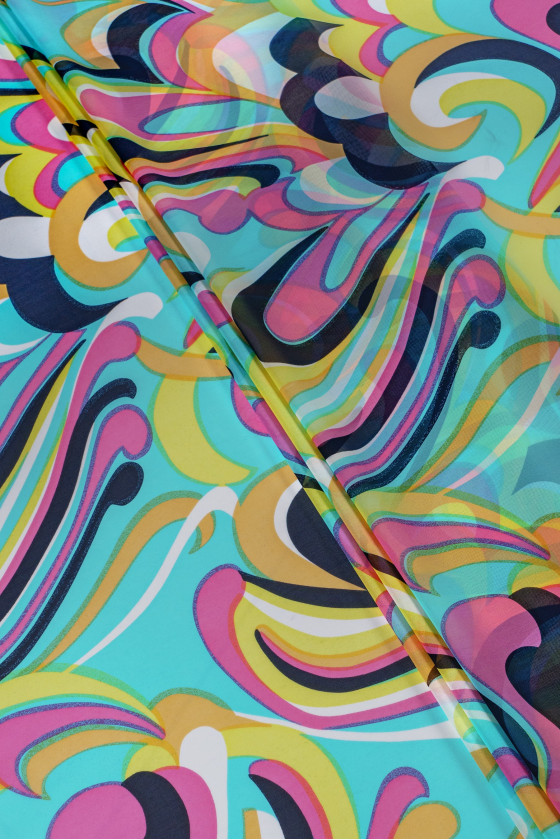 Itališkas šifonas 100% šilkas su spalvingais, išgalvotais raštais. Žinomo mados dizainerio charakteristika charakteringas motyvas. Šifonas, pagamintas iš natūralaus šilko, yra labai subtilus, erdvus ir skaidrus audinys. Puikiai tinka erdvioms suknelėms ir palaidinėms. Neelastingas audinys.
