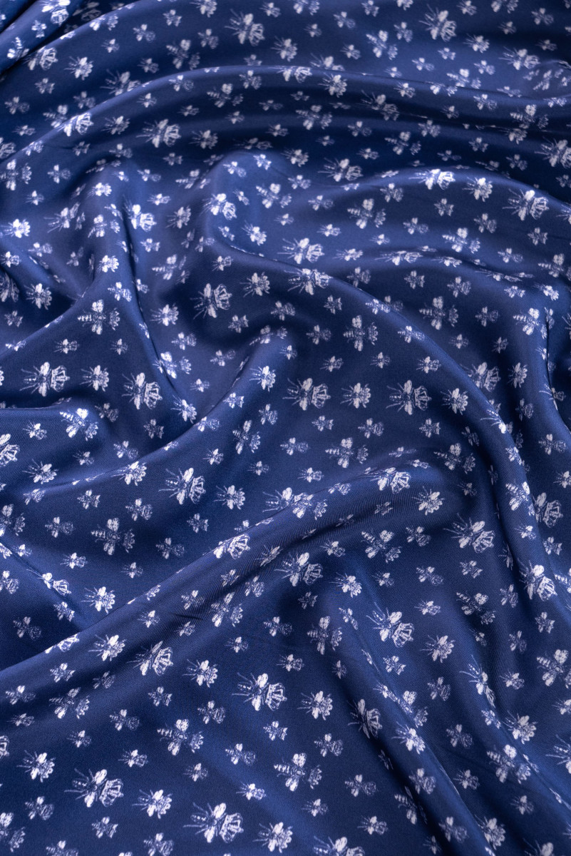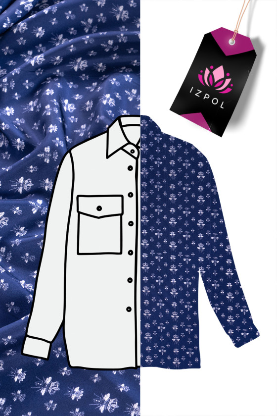 Itališkas 100% šilkinis audinys tamsiai mėlynos spalvos su mažų peteliškių motyvu balta spalva. Šilko twill yra audinys su pynimu, minkštas, labai patvarus, švelniai standus, kad tilptų.