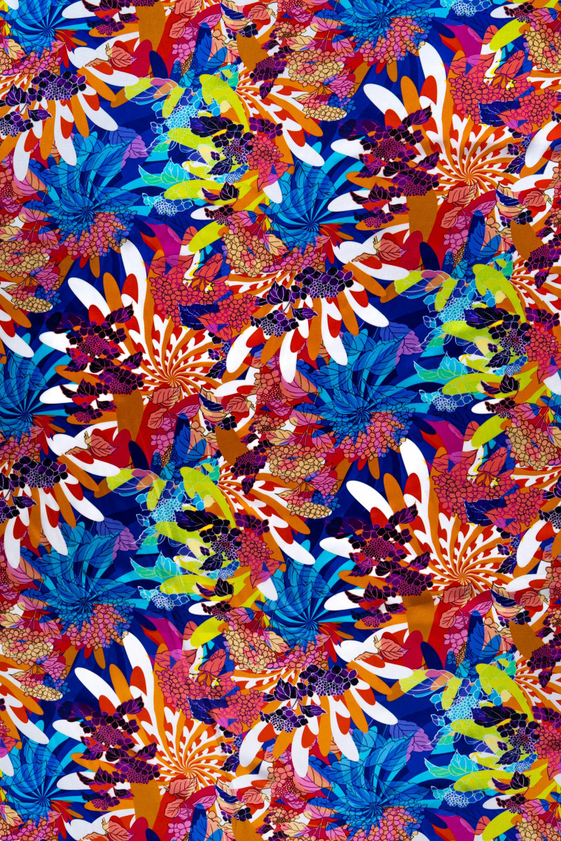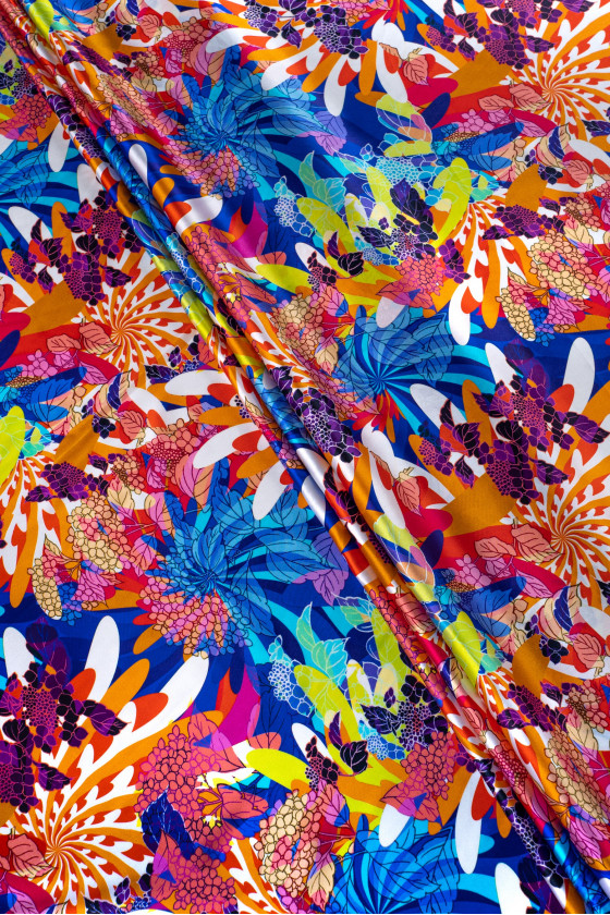 Itališkas šilko satinas, elastingas su gėlių ir lapų motyvu violetinės, oranžinės, rugiagėlės ir rožinės spalvos atspalviais.