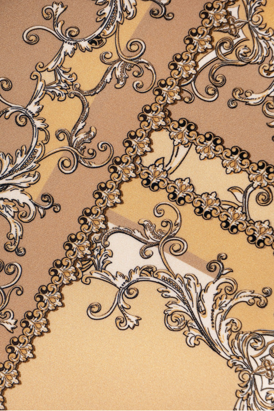 Itališkas satinas 100% šilkas įvairiais smėlio spalvos atspalviais su juodos spalvos motyvu, mažais ornamentais, kurie sukuria fragmentišką motyvą - atspaudas pagamintas iš matinės pusės. Šilko satinas yra tankus ir lengvas audinys su plokščiu paviršiumi, pagamintas iš satino pynimo. Papildomas pranašumas yra jo lygumas ir ilgaamžiškumas, taip pat tai, kad jis labai gerai tinka, nerodo ir yra malonus liesti. Viena vertus, jis yra matinis, kita vertus, jis yra švelniai blizgus. Jis gali būti naudojamas erdvioms suknelėms, subtilioms palaidinėms, sijonams, šalikams, šalikams užburti.