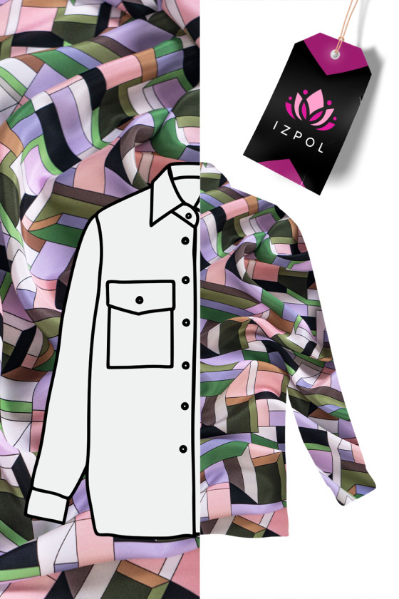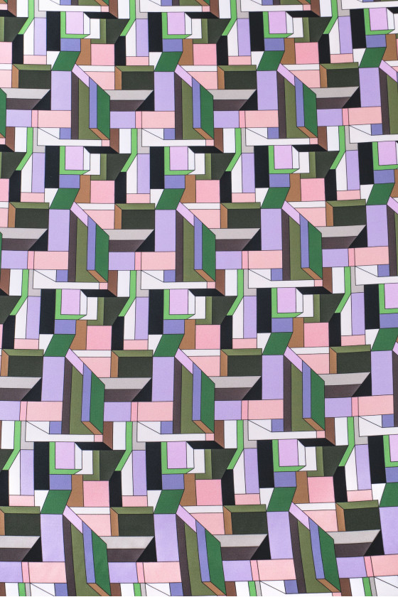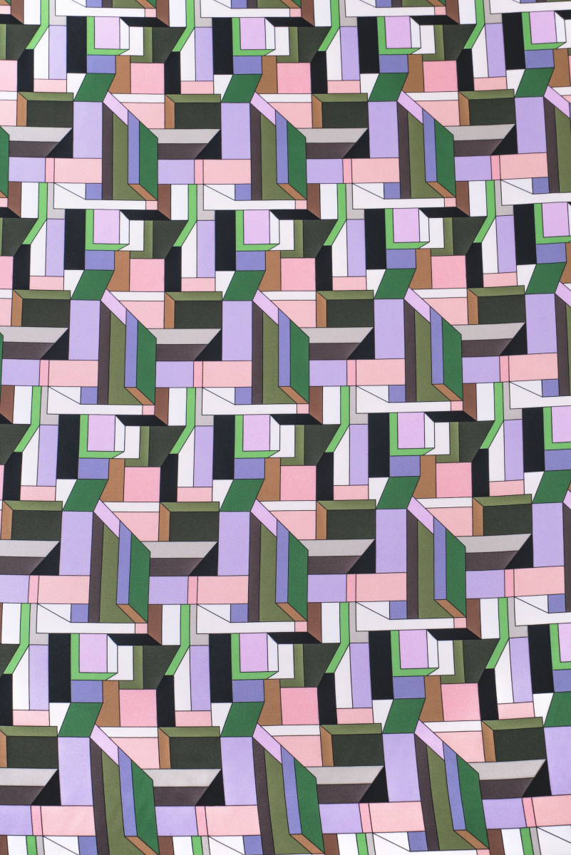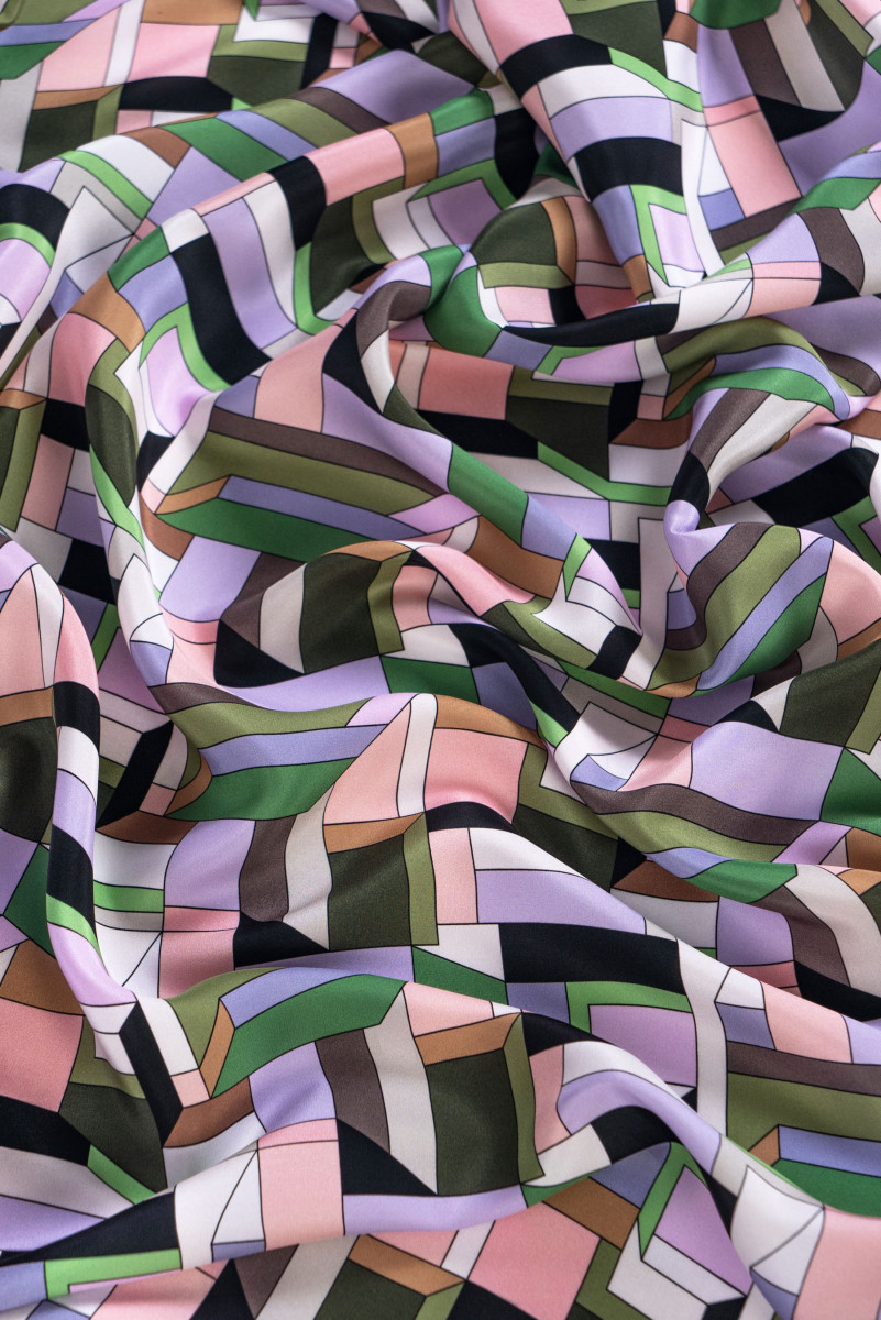 Itališkas 100% šilko satinas su geometriniu motyvu šiomis spalvomis: juoda, viržių, žalia, pilka ir rožinė - atspaudas pagamintas matinėje pusėje. Šilko satinas yra tankus ir lengvas audinys su plokščiu paviršiumi, pagamintas iš satino pynimo. Papildomas pranašumas yra jo lygumas ir ilgaamžiškumas, taip pat tai, kad jis labai gerai tinka, nerodo ir yra malonus liesti. Viena vertus, jis yra matinis, kita vertus, jis yra švelniai blizgus. Jis gali būti naudojamas erdvioms suknelėms, subtilioms palaidinėms, sijonams, šalikams, šalikams užburti.