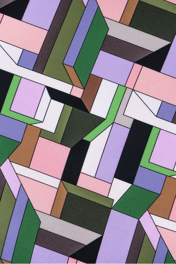 Itališkas 100% šilko satinas su geometriniu motyvu šiomis spalvomis: juoda, viržių, žalia, pilka ir rožinė - atspaudas pagamintas matinėje pusėje. Šilko satinas yra tankus ir lengvas audinys su plokščiu paviršiumi, pagamintas iš satino pynimo. Papildomas pranašumas yra jo lygumas ir ilgaamžiškumas, taip pat tai, kad jis labai gerai tinka, nerodo ir yra malonus liesti.