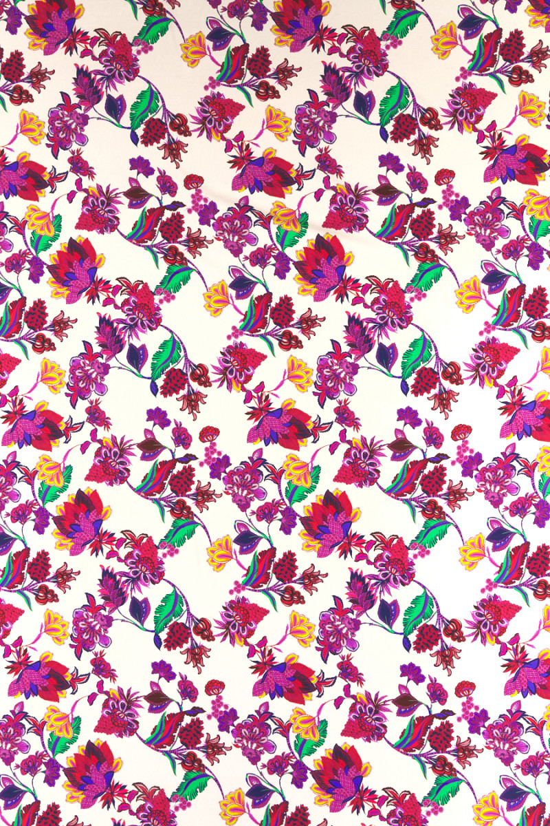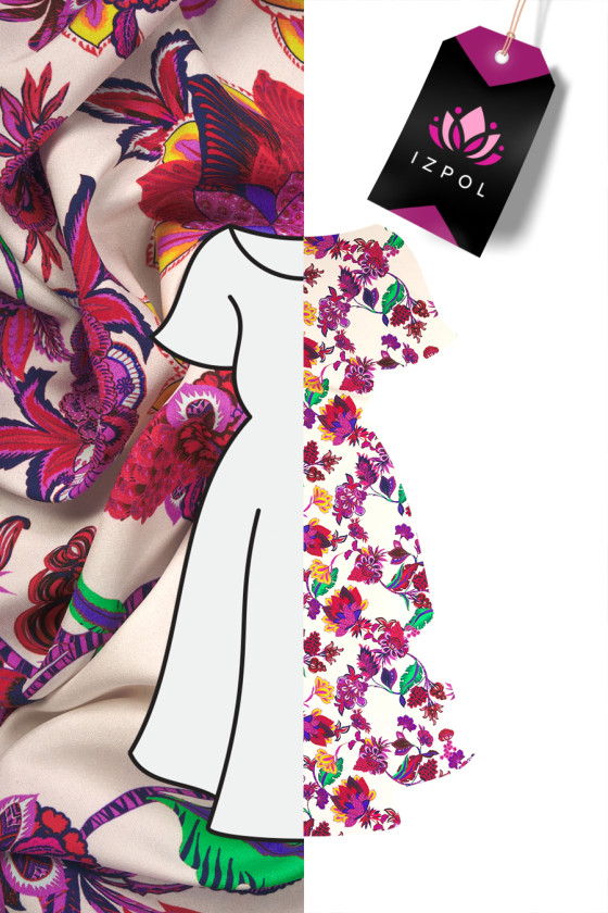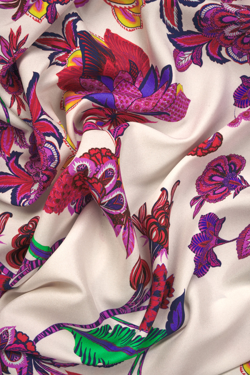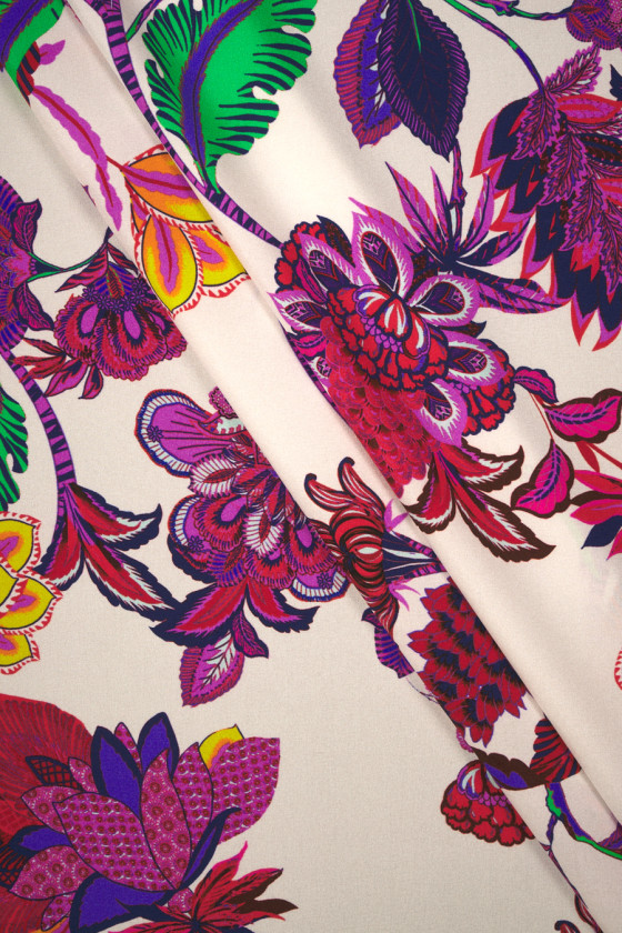 Itališkas šilko satinas, elastingas ecru spalvos su spalvingų gėlių motyvu - atspaudas padarytas matinėje pusėje. Šilko satinas yra tankus ir lengvas audinys su plokščiu paviršiumi, pagamintas iš satino pynimo. Papildomas pranašumas yra jo lygumas ir ilgaamžiškumas, taip pat tai, kad jis labai gerai tinka, nerodo ir yra malonus liesti. Viena vertus, jis yra matinis, kita vertus, jis yra švelniai blizgus. Jis gali būti naudojamas erdvioms suknelėms, subtilioms palaidinėms, sijonams, šalikams, šalikams užburti.