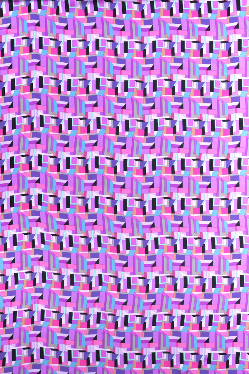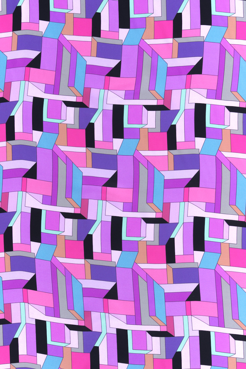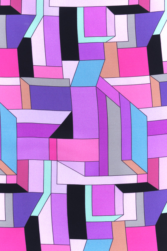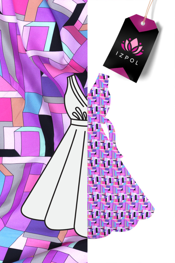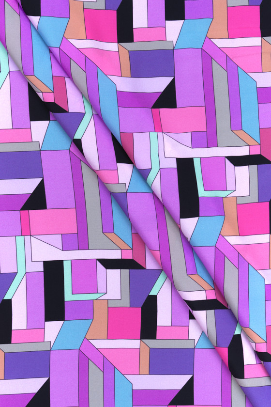 Itališkas satinas 100% šilkas su smulkiu geometriniu raštu. Labai įdomus rožinės, violetinės, grietinėlės, mėtų, fuksijos ir juodos spalvos derinys, kuris sukuria mažus, netaisyklingus geometrinius raštus. Visuma laikoma labai "teigiamoje" spalvų schemoje, be to, atspaudas buvo padarytas matinėje pusėje, todėl audinys tik šiek tiek šviečia. Fantastiškas pasiūlymas beprotiškoms asmenybėms, mėgstančioms išsiskirti.