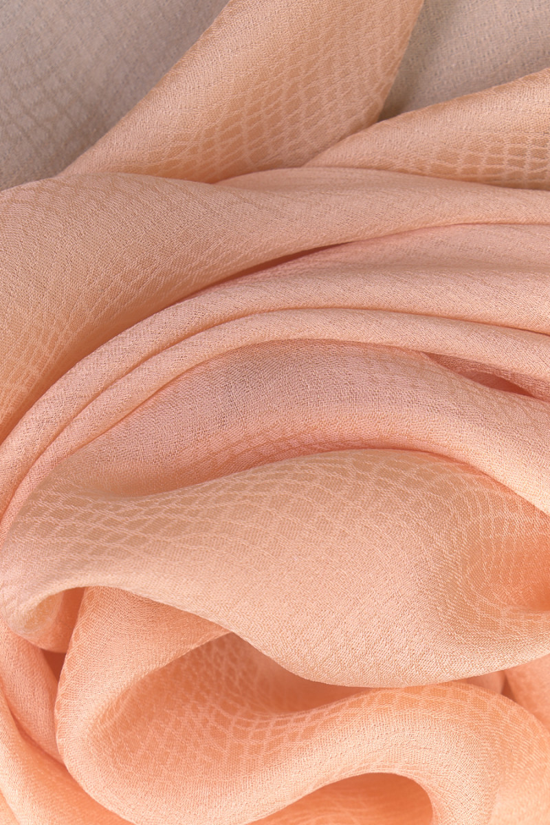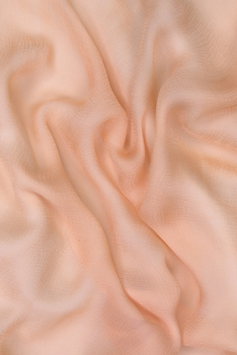 Itališkas 100% šilko audinys abrikosų spalvos. Audinys turi laisvesnį, labai smulkų žakardo pynimą, panašų į gyvatės odą. Jis yra plonas, erdvus ir šiek tiek skaidrus. Fantastiškas pasiūlymas siūti lengvą palaidinę ar suknelę. Jei jums patinka kilnūs madingų spalvų audiniai, tai audinys kaip tik jums.