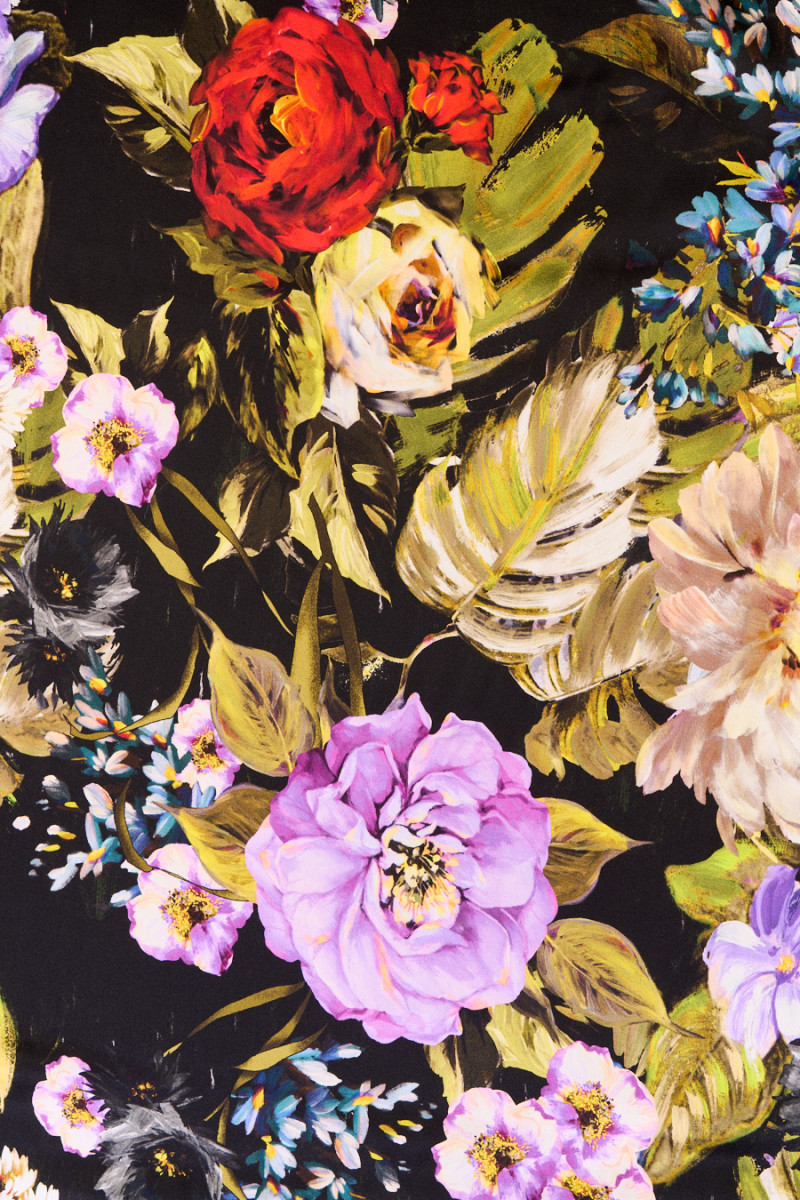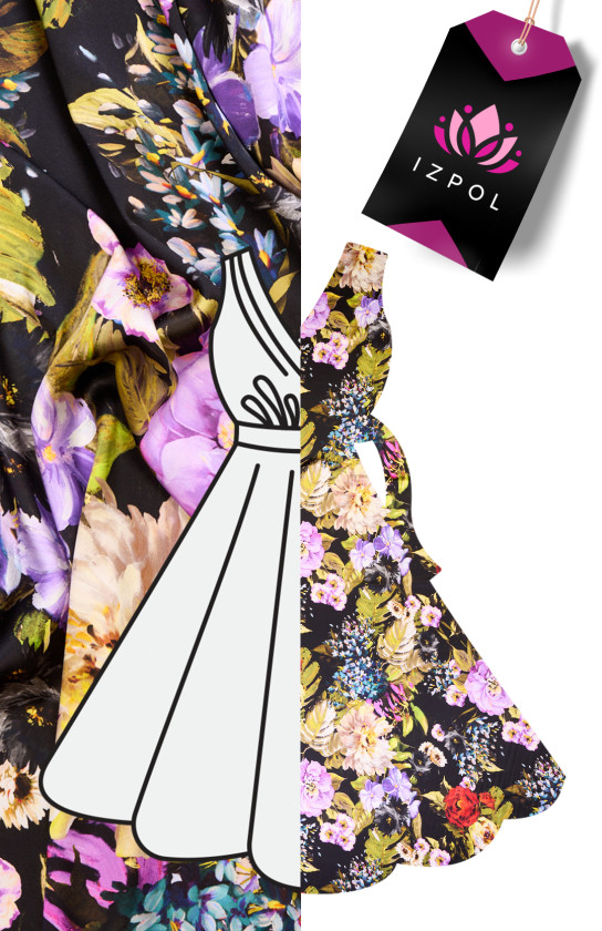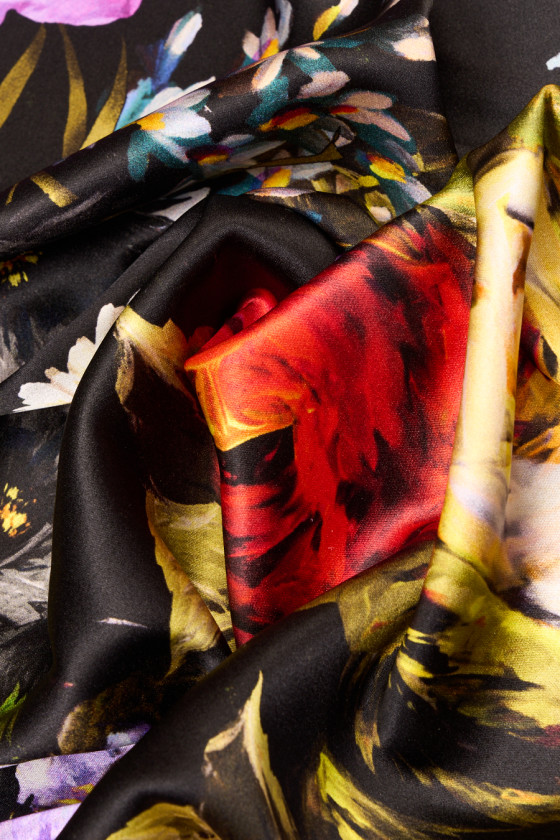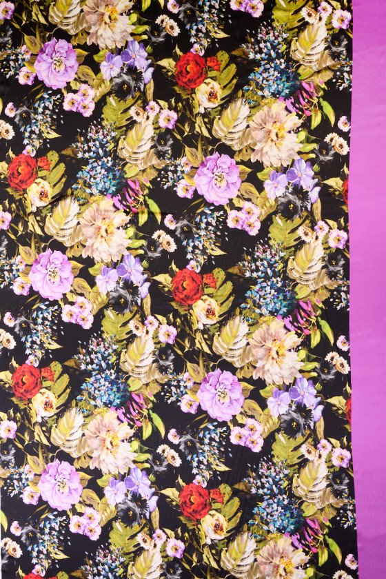 Itališkas šilko satinas su elastanu su dažytomis gėlėmis juodame fone. Dideli įvairių dydžių gėlių motyvai violetinės, žalios, raudonos, juodos spalvos atspalviais, praturtinti mažesnėmis jūros spalvos gėlėmis. Vienas kraštas dekoruotas 16 cm pločio violetine riba. Gražus pasiūlymas žmonėms, kurie mėgsta gėlių raštus. Pridėjus elastano, jį patogiau dėvėti ir mažiau raukšlių. Tai puikiai tinka siūti originalius marškinius, suknelę, sijoną ir laisvesnes kelnes.