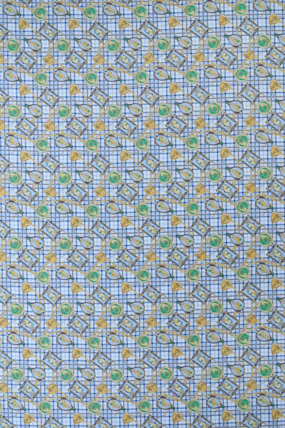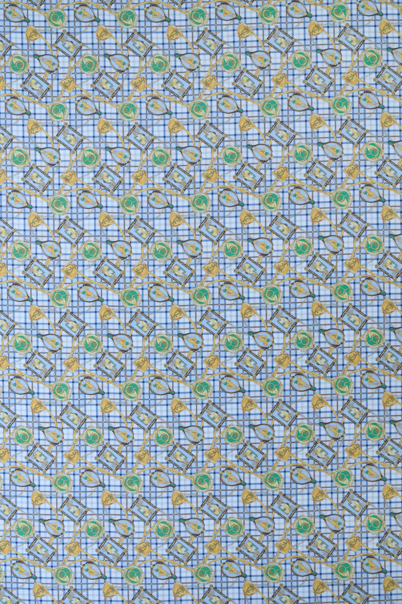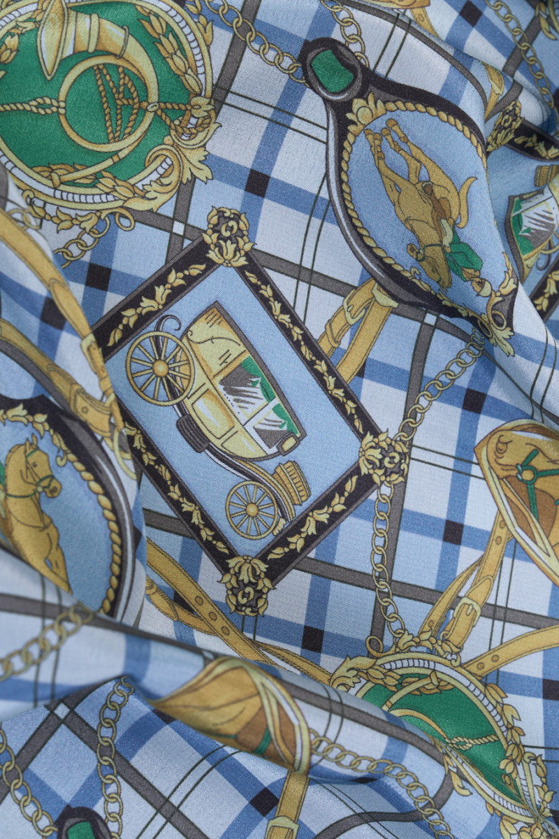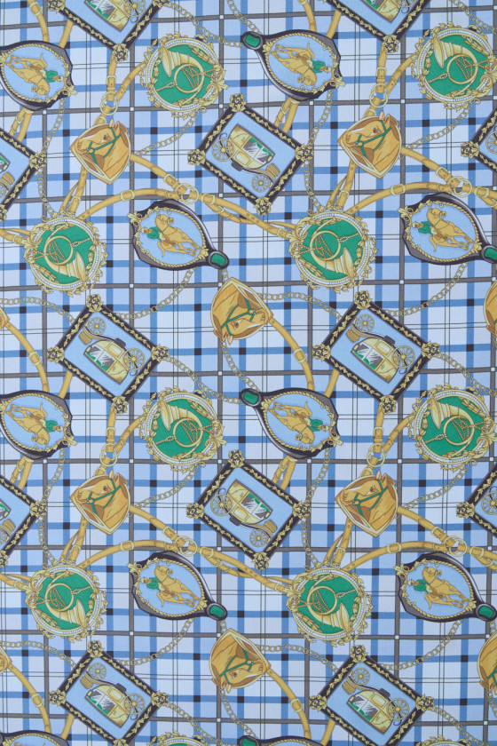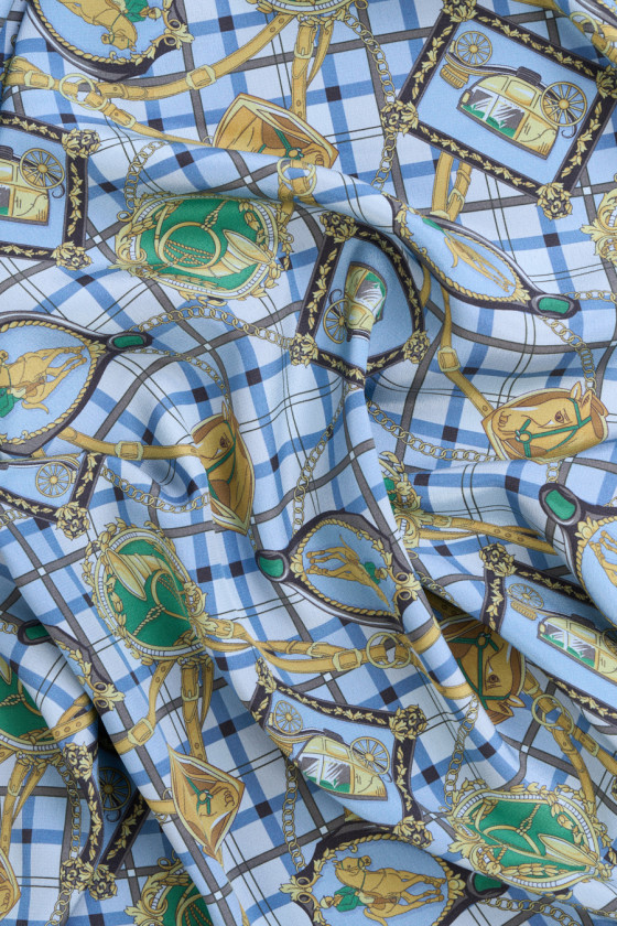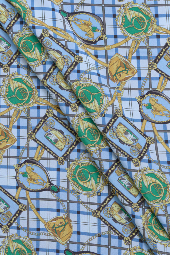 Itališkas 100% šilko krepas su jojimo motyvais mėlyname fone. Tankus jojimo modelis vaizduoja reguliariai išdėstytus arklio, vežimo, trimito ir raitelio paveikslėlius dekoratyviniuose rėmuose nuo 5 cm iki 7 cm. Audinio fonas su languotu atspaudu papildomai užpildytas aukso spalvos juostelėmis ir grandinėmis. Įdomus pasiūlymas dizainerių drabužių gerbėjams, nes jis kilęs iš žinomo mados dizainerio kolekcijos. Audinys yra lengvas, tekantis, plonas, bet nepermatomas, puikiai tinka siūti erdvią suknelę, sijoną ar palaidinę.