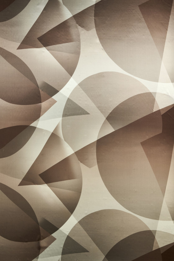 Itališkas 100% šilko satinas su geometriniu motyvu rudos, smėlio ir pilkos spalvos atspalviais. Didelis raštas, vaizduojantis apskritimus ir trikampius, kurie sutampa, ant viso atspausdinamas labai smulkaus tinklelio raštas, kuris suteikia medžiagai įdomią išvaizdą. Audinys yra nepermatomas, tekantis, minkštas, neelastingas ir blizgus. Rekomenduojame prie suknelių, sijonų, palaidinių ir marškinių.