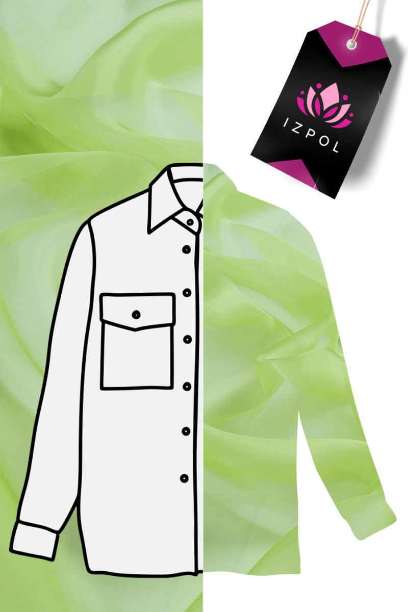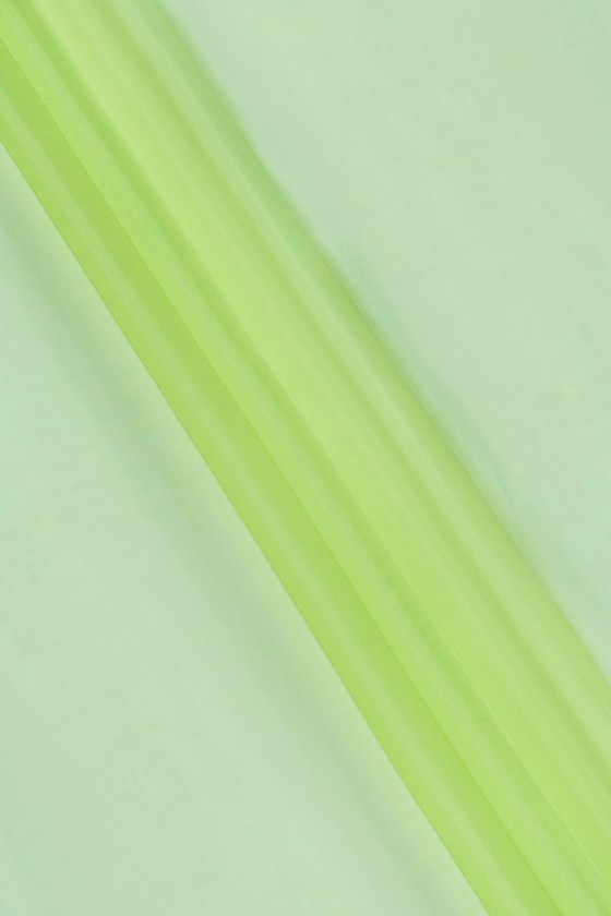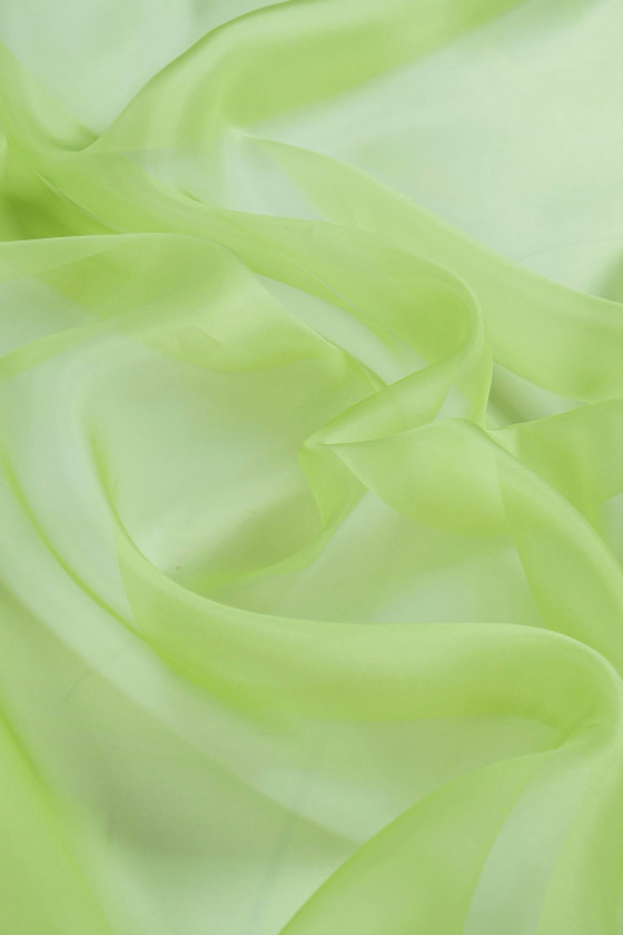 Itališkas 100% šilko organzos audinys šviesiai žalios spalvos. Natūralaus šilko organza yra plonas, skaidrus, bet standus audinys, pasižymintis subtiliu blizgesiu, būdingu šilko audiniams.