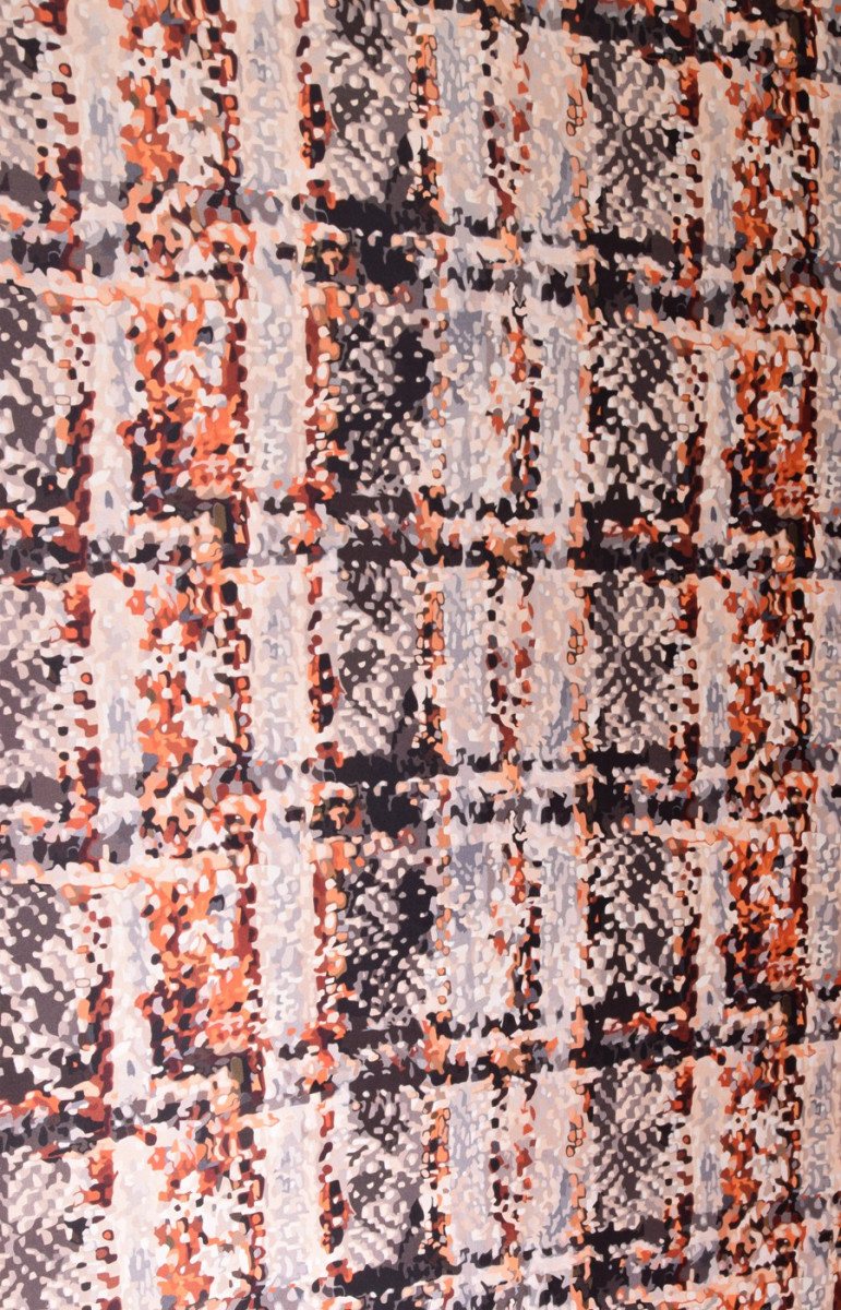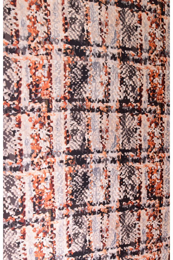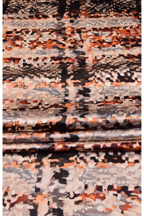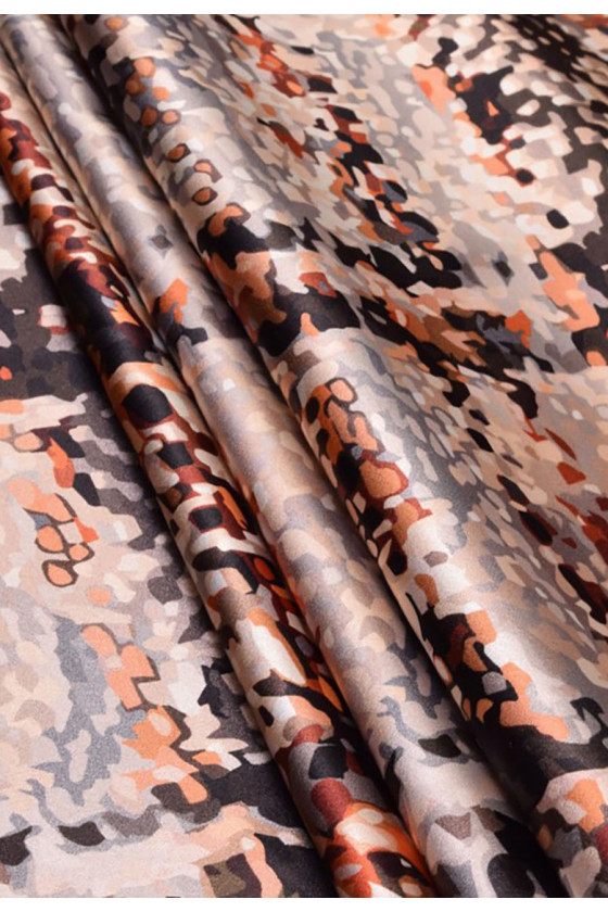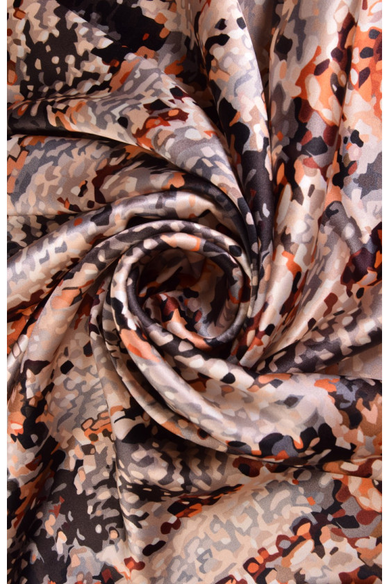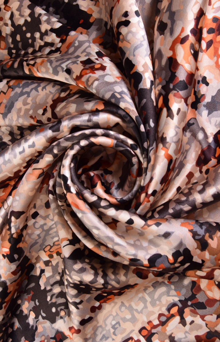 Šilko satinas dideliame čekių atspaude yra subtilus audinys, aksominis liesti, subtilus blizgesys. Jis gali būti naudojamas erdvioms suknelėms, subtilioms palaidinėms, šalikams, šalikams.