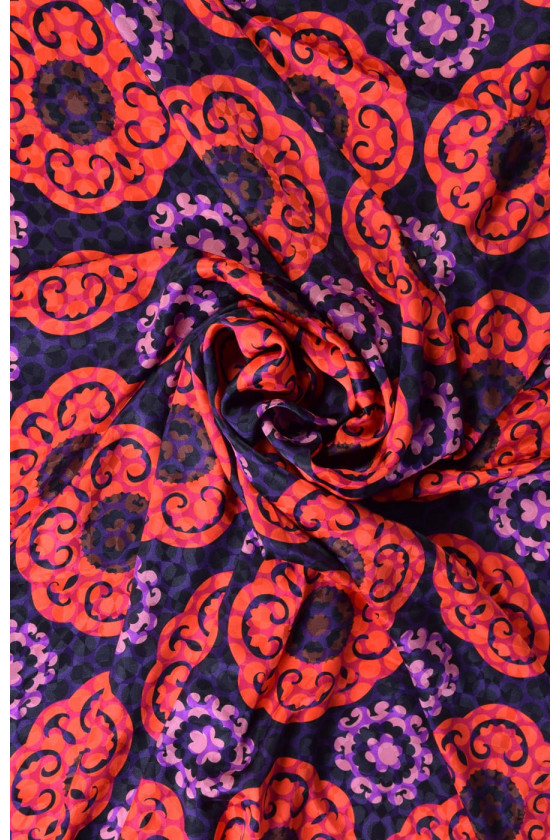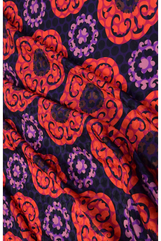 Gražus žakardo šilkas. Plonas, nelankstus, subtilus. Nepermatomas audinys. Puikiai tinka suknelėms ir palaidinėms.