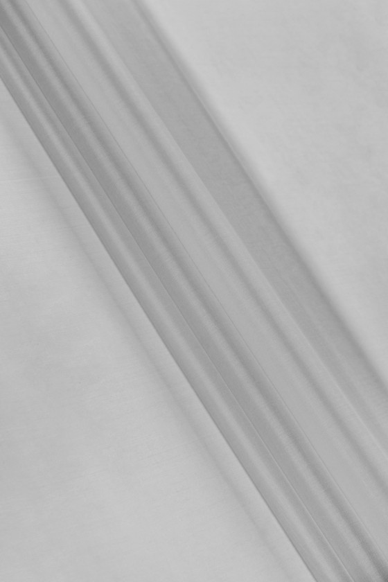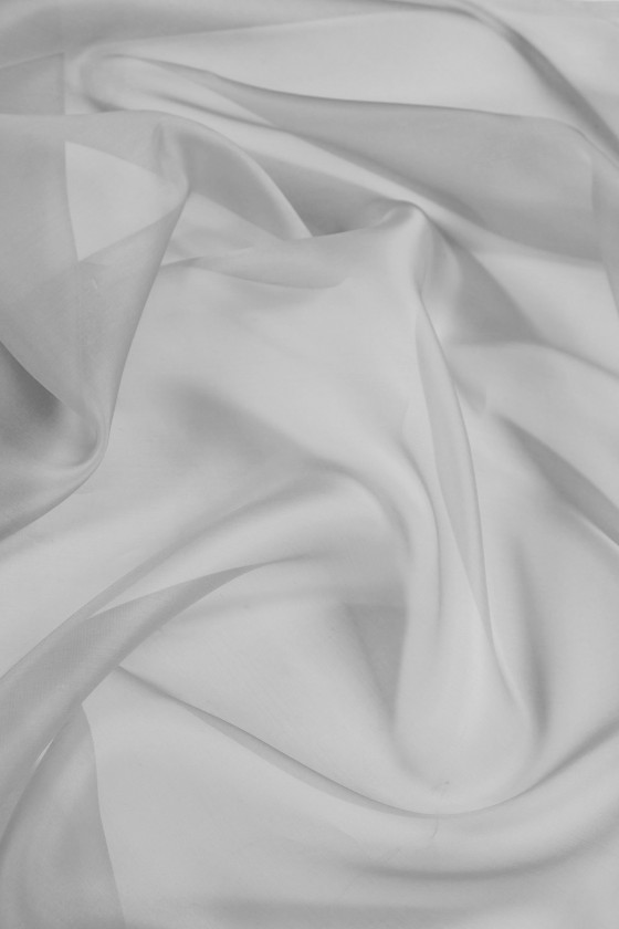 Itališkas 100% šilko organzos audinys šviesiai pilkos spalvos. Natūralaus šilko organza yra plonas, skaidrus, bet standus audinys, pasižymintis subtiliu blizgesiu, būdingu šilko audiniams.