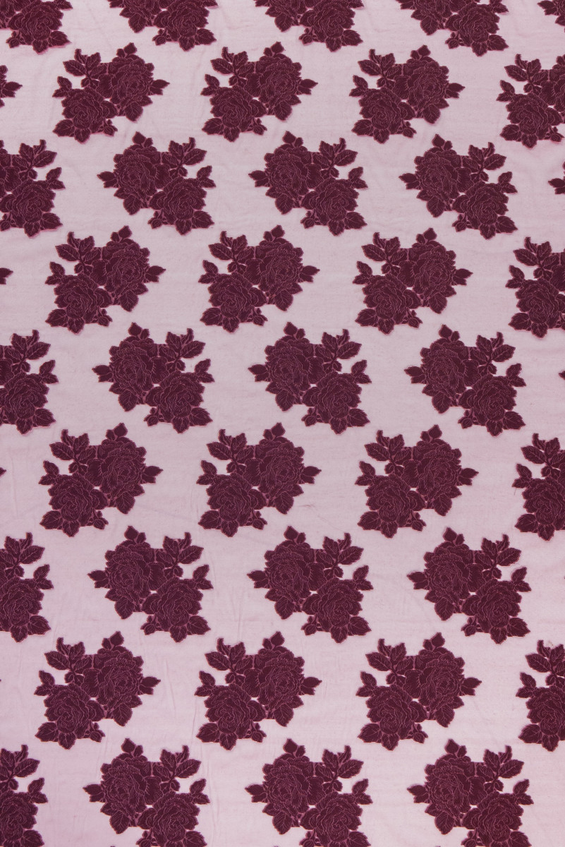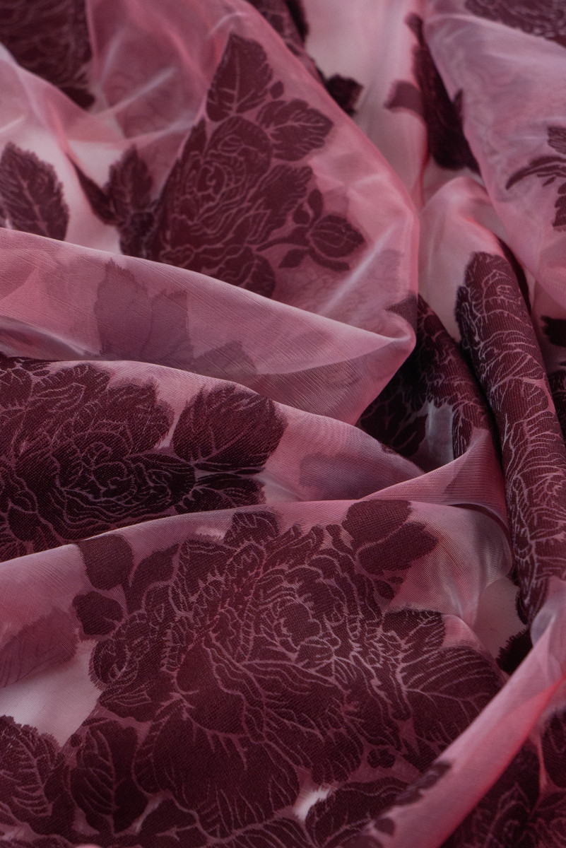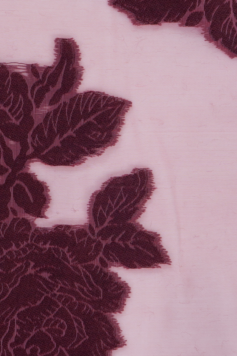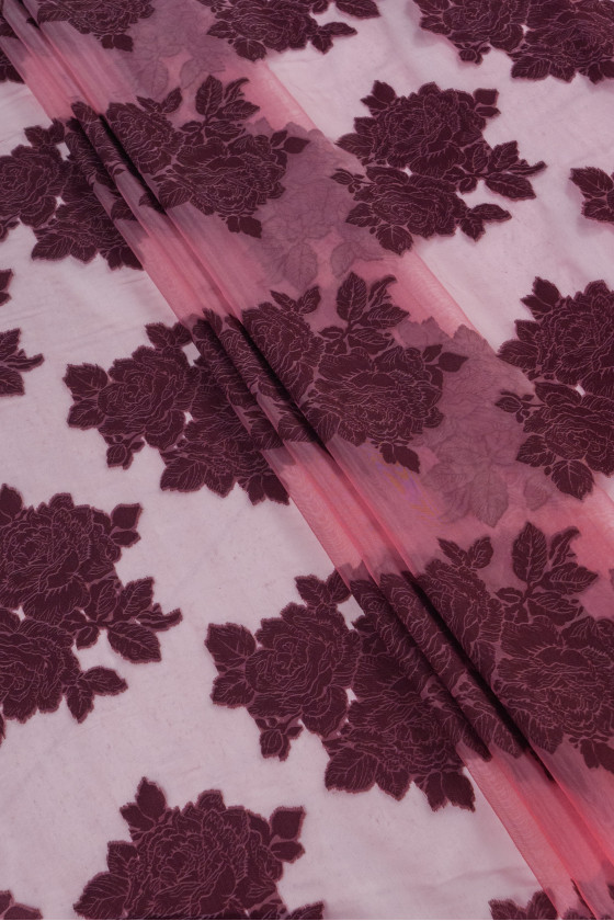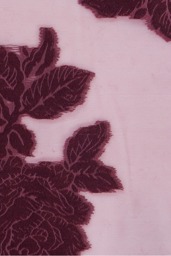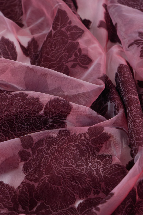 Graži organza su išsiuvinėtomis gėlėmis Bordo. Organza yra vaivorykštė ir keičia spalvas, spindi į raudoną ir baltą spalvas. Audinys yra neelastingas, šiek tiek standus.