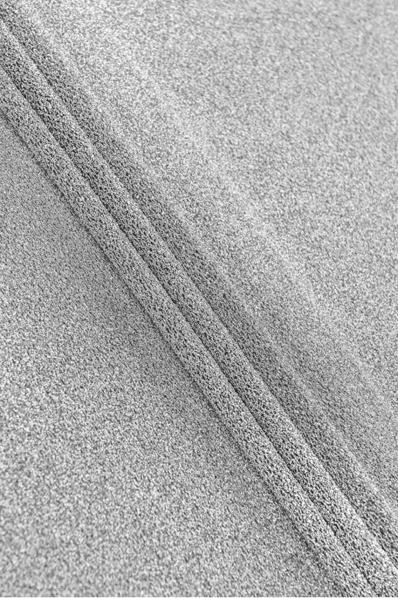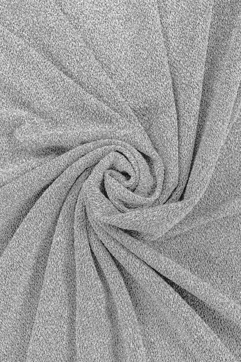 Itališkas sidabro spalvos poliesterio megztas audinys su georgette pynimo lurekso siūlu. Audinys yra šiek tiek elastingas, nepermatomas, labai efektyvus, sidabro siūlai sukuria šiek tiek išgaubtą struktūrą. Idealus pasiūlymas palaidinėms, suknelėms, išvykos ir sceninio pobūdžio sijonams.