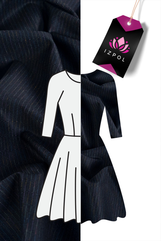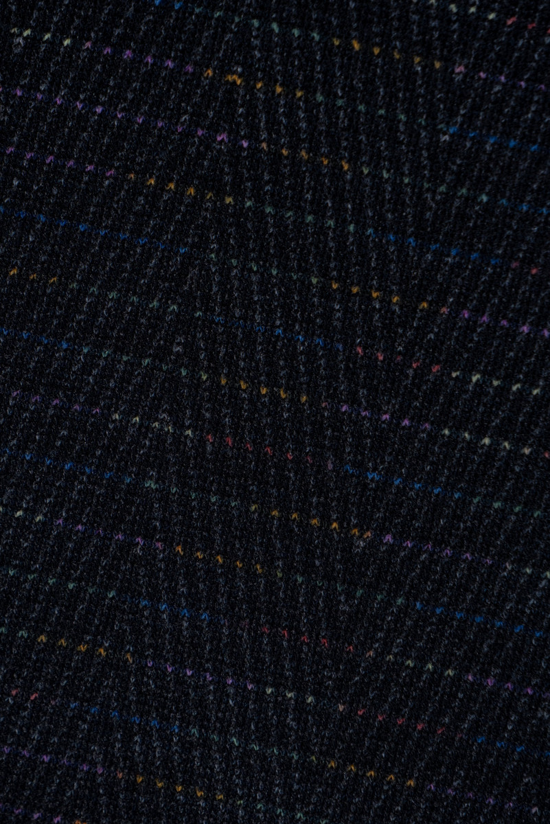 Itališkas trikotažinis megztas juodos spalvos audinys su spalvingų juostelių motyvu. Džersio megztas audinys yra dengiamasis audinys su tankiu pynimu, elastingas, švelniai aptrauktas, kurį galima siūti be pamušalo. Tai puikiai tinka kasdienėms suknelėms, sijonams, švarkams ar kelnėms.