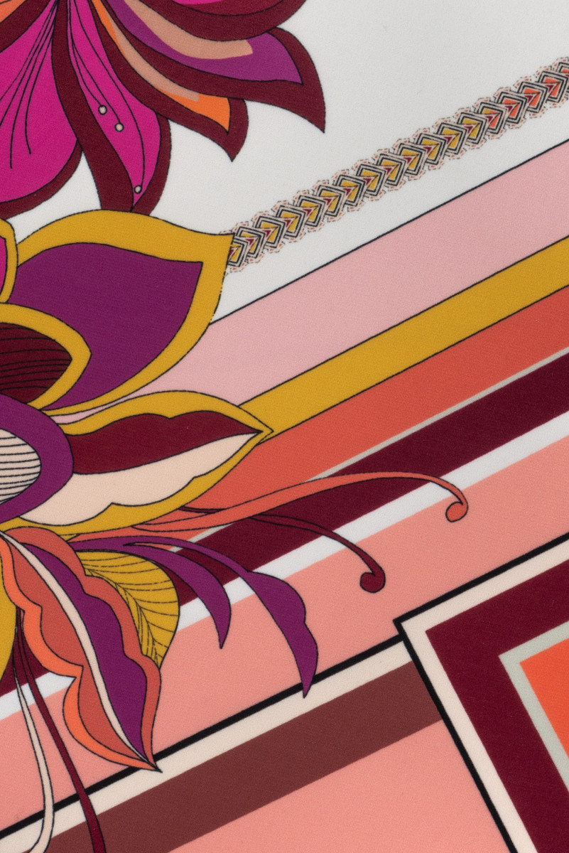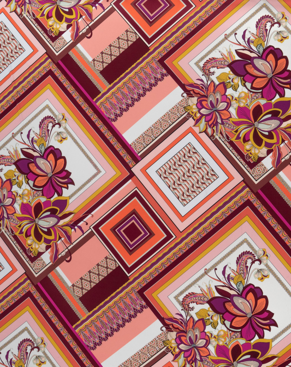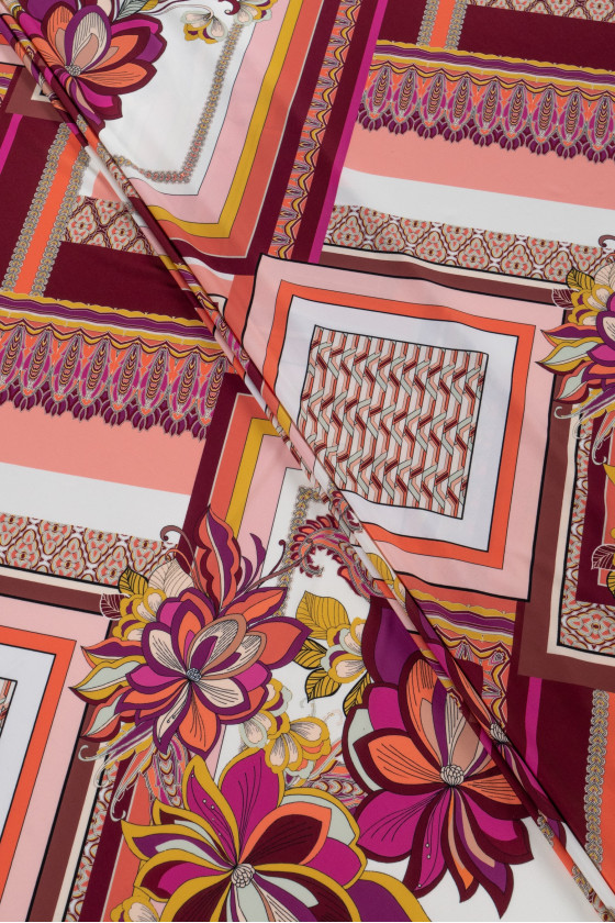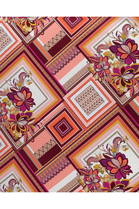 Itališkas poliesterio megztas audinys su margaspalviu motyvu su gėlėmis ir geometriniais elementais. Plonas, bet nepermatomas, matinis, labai elastingas megztas audinys - puikiai tinka vasaros suknelės, palaidinės, sijono ar pareo siuvimui.