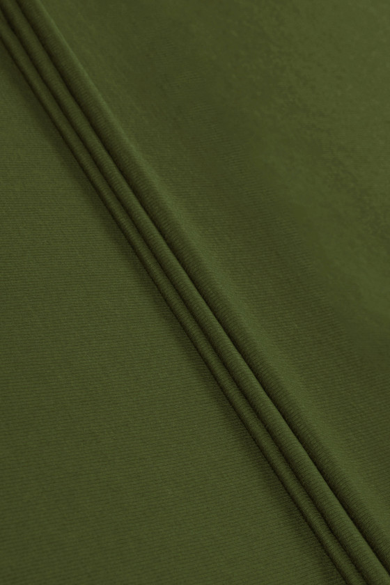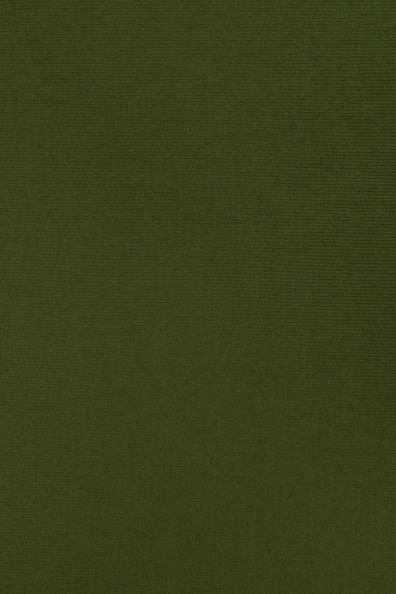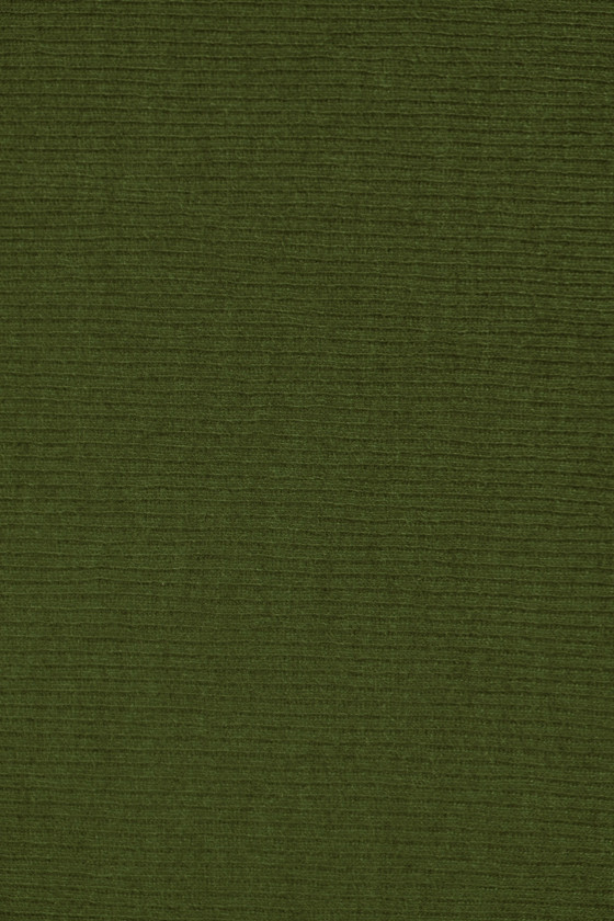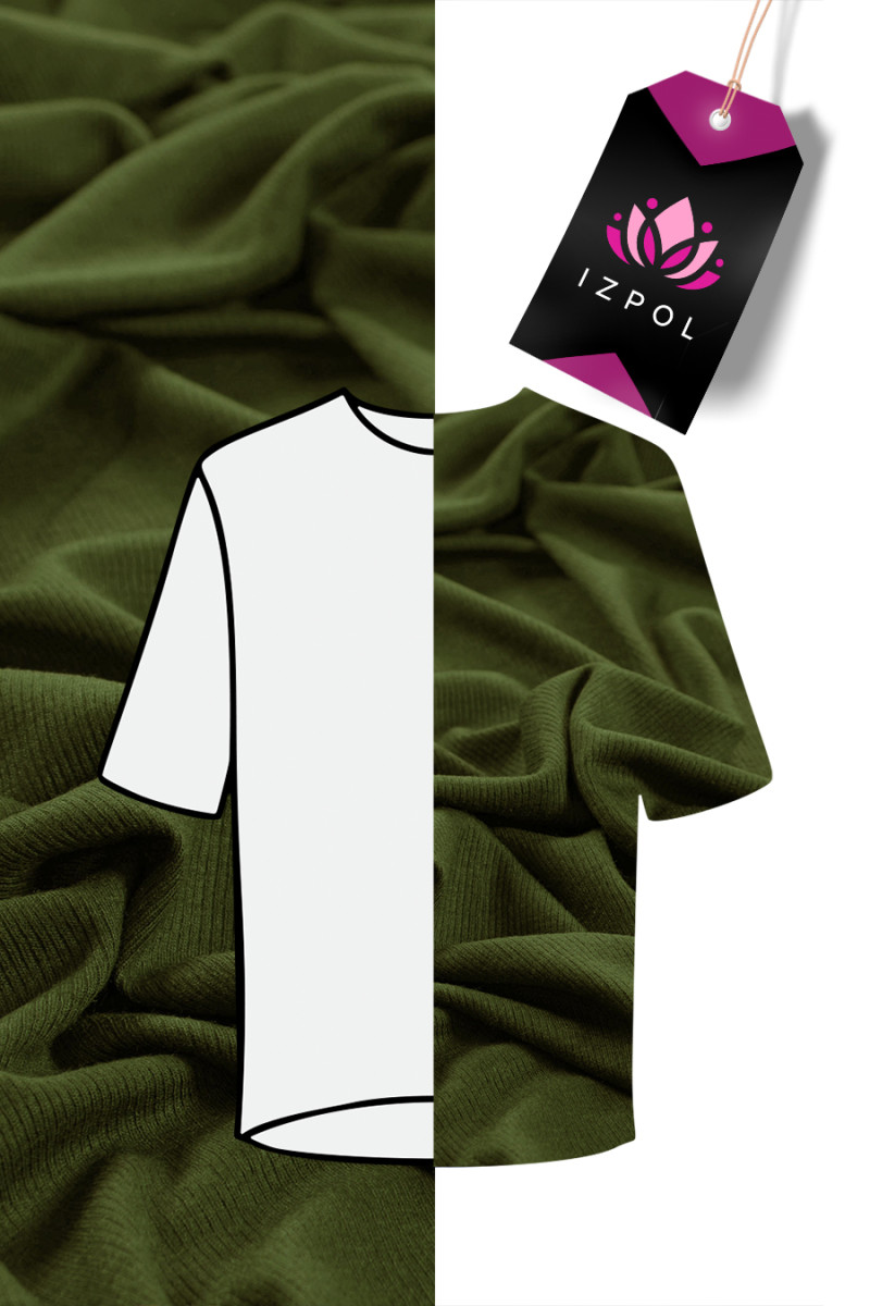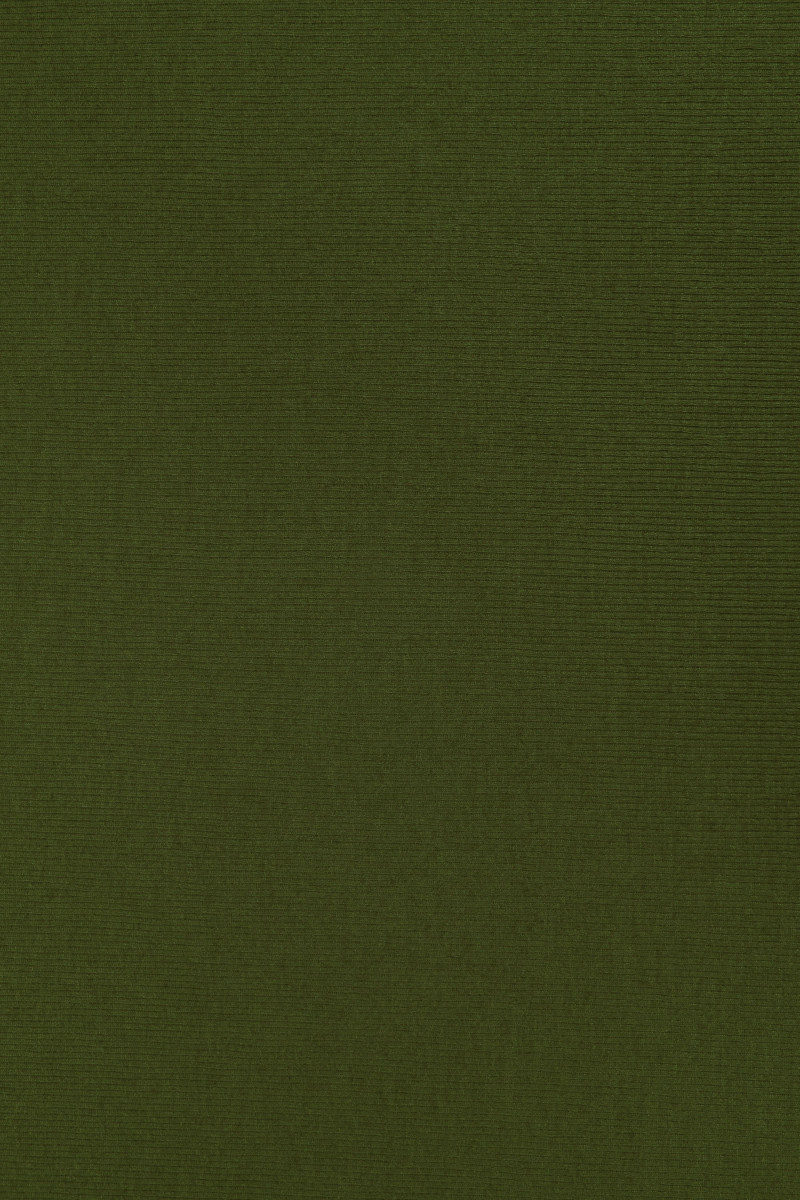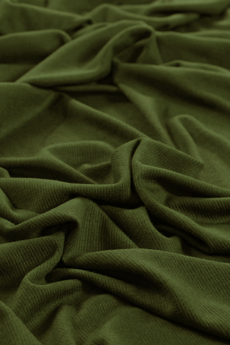 Itališkas medvilninis megztas audinys alyvuogių žalios spalvos, 110 cm pločio. Audinys su būdingu, briaunotu pynimu, panašiu į welt.