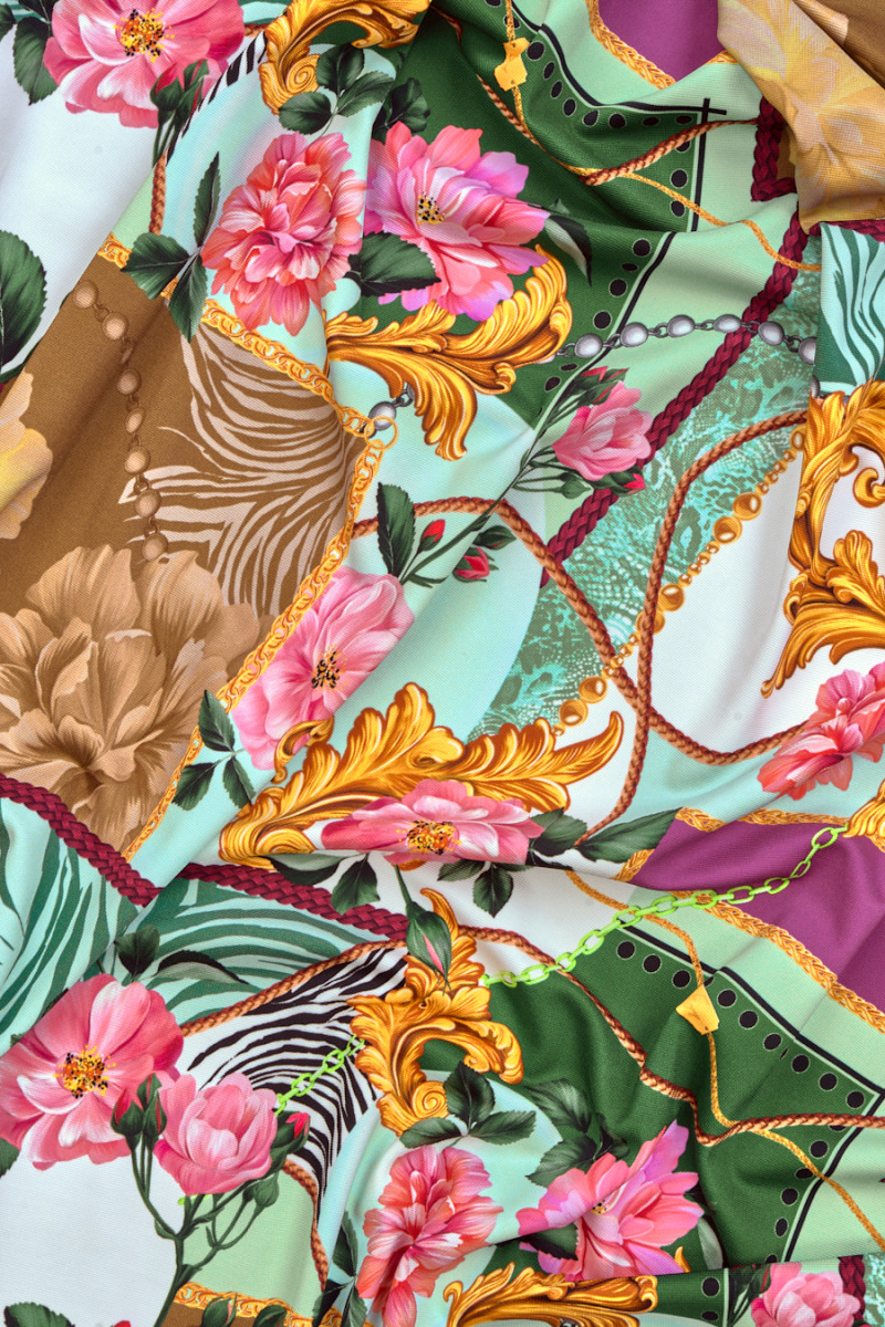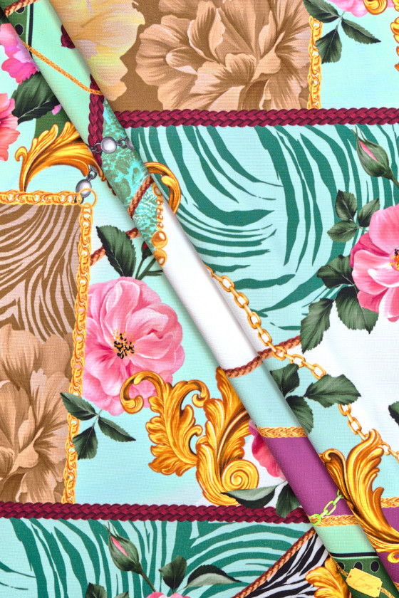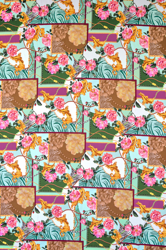 Itališkas, storas ir mėsingas viskozės megztas audinys su spalvingu, margu dideliu raštu. Audinys žmonėms, norintiems turėti viską iš karto - didelės gėlės (nuo 9-13 cm), rytietiški motyvai, zebro maišelis, grandinės ir papuošalai.