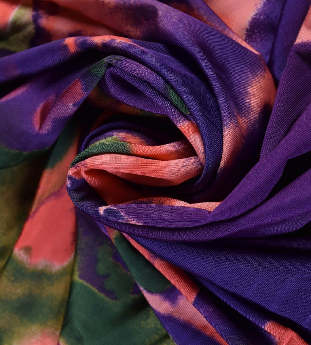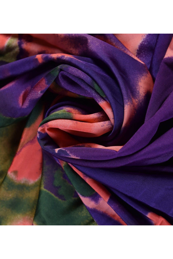 Itališkas violetinės spalvos viskozės megztas audinys su gėlių motyvu, audinys yra kupono dydžio 115 cm * 140 cm. Megztas slidaus - vėsinančio tipo audinys.