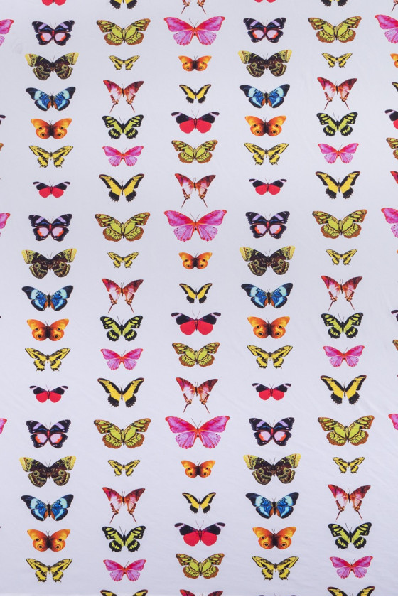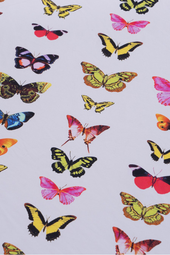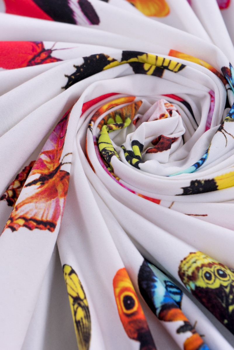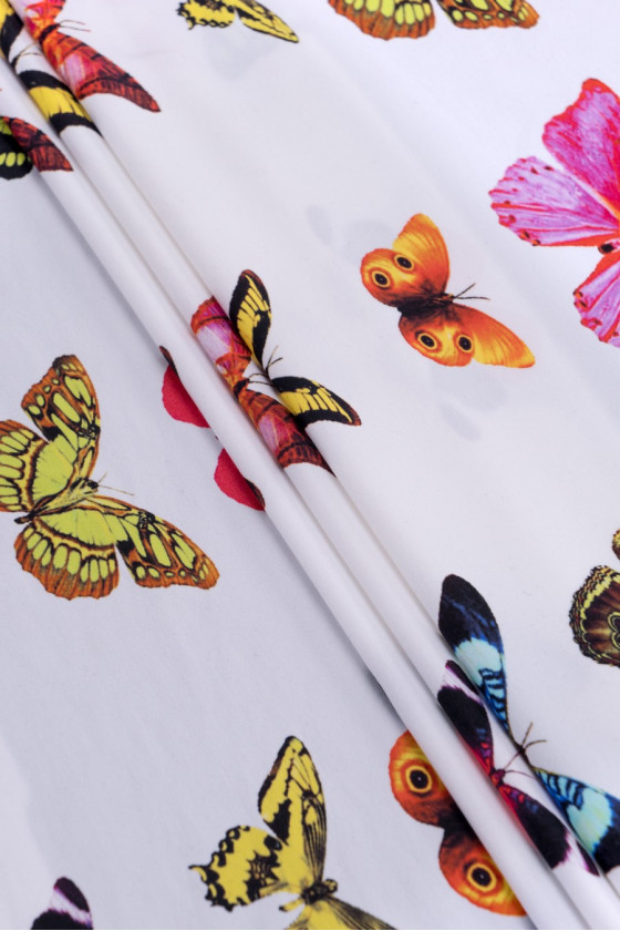 Lycra megztas audinys su spalvingais drugeliais ecru fone. Megztas audinys yra labai elastingas, nepermatomas ir matinis. Puikiai tinka vasarinėms palaidinėms ar suknelėms, sijonams ar vasarinėms pareoms.