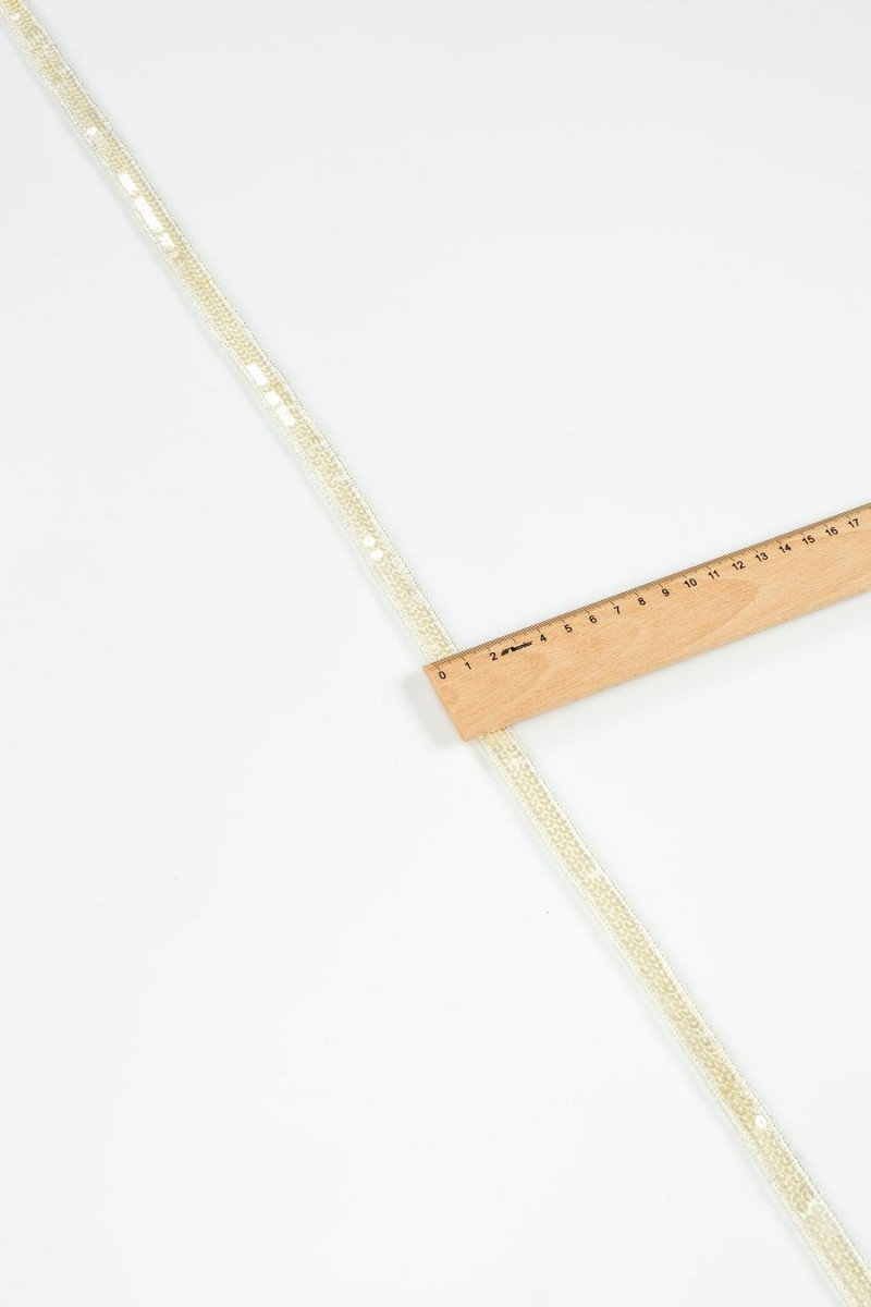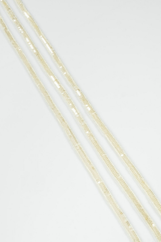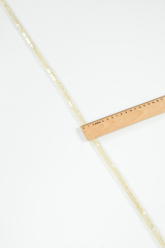 Itališka galanterijos juosta ekru spalvos. Vidurys dekoruotas blizgučiais, o kraštai apipjaustyti karoliukais. Plotis: 1 cm.