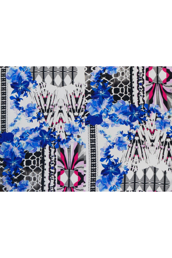 Itališkas audinys 100% viskozė su georgette pynimu. Įdomus gėlių ir geometrinių raštų motyvas baltame fone. Minkštas, tekantis, neelastingas audinys - puikiai tinka suknelės, sijono, palaidinės siuvimui.