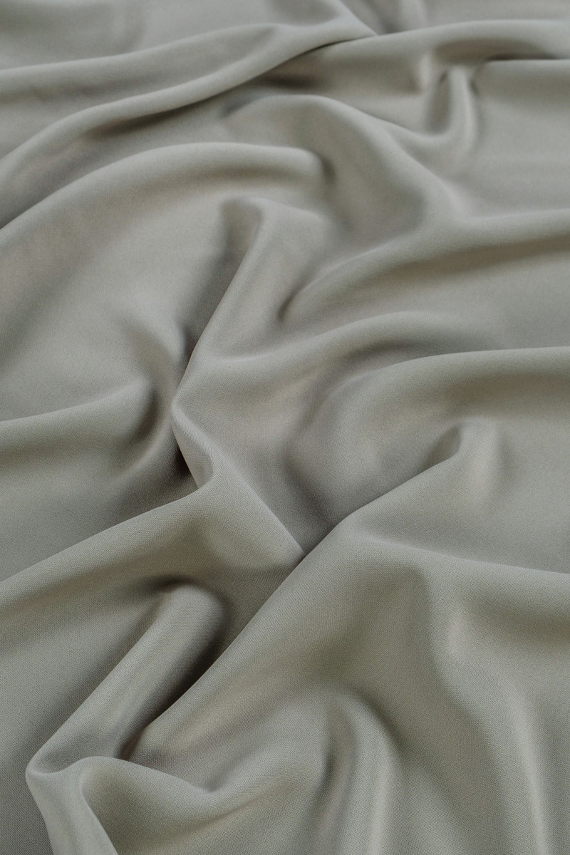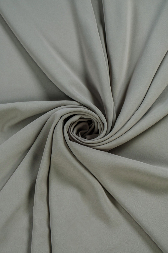Itališkas cadi viskozės audinys šviesiai pilkos spalvos. Cadi suknelės audinys yra nepermatomas, mėsingas, tekantis (sunkus), matinis, šiek tiek elastingas.