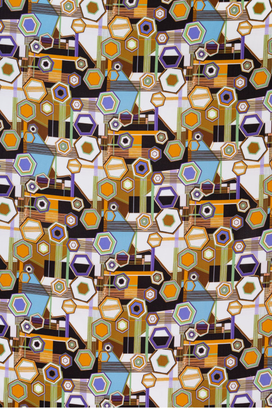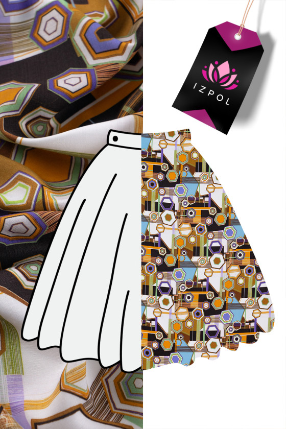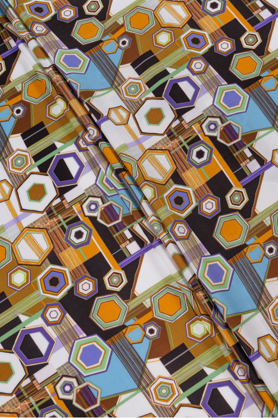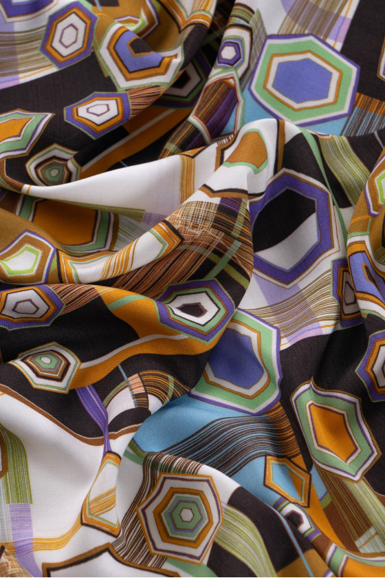 Itališkas 100% viskozės audinys kreminės spalvos su spalvingu geometriniu raštu. Viskozė yra audinys, gaunamas iš celiuliozės, labai kvėpuojantis ir minkštas, draugiškas odai (nealergizuojantis) ir puikiai sugeria drėgmę. Neelastingas, nepermatomas audinys - puikiai tinka vasaros suknelės, palaidinės ar sijono siuvimui.