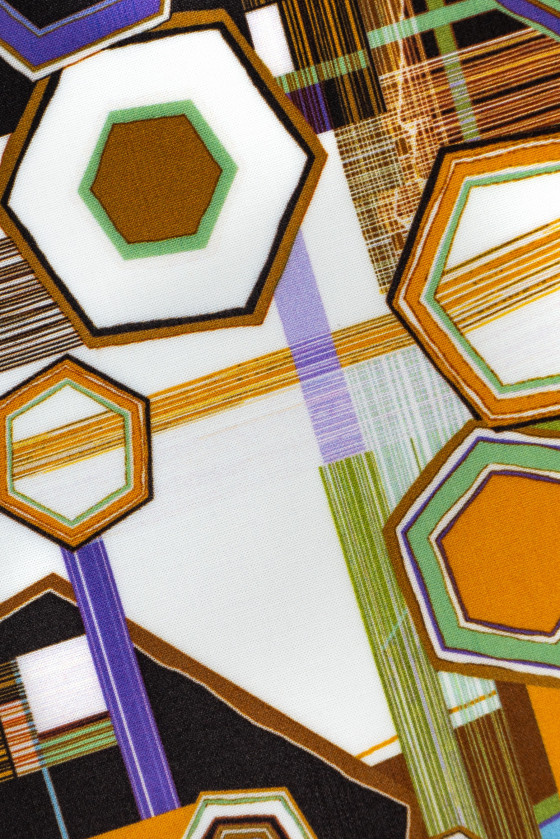Itališkas 100% viskozės audinys kreminės spalvos su spalvingu geometriniu raštu. Viskozė yra audinys, gaunamas iš celiuliozės, labai kvėpuojantis ir minkštas, draugiškas odai (nealergizuojantis) ir puikiai sugeria drėgmę.