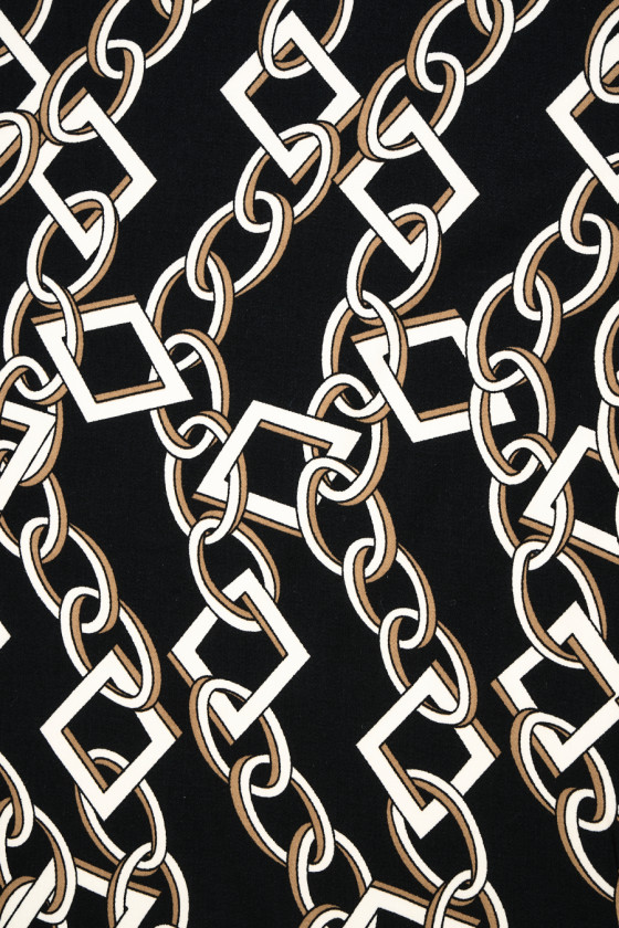 Itališkas audinys 100% viskozė su grandinės motyvu juodame fone. Tankus ir reguliarus modelis, pagamintas iš kreminės ir smėlio spalvos, viena grandinė yra apie 2,5 cm pločio. Audinys teka, minkštas, malonus liesti, plonas, bet nepermatomas ir neelastingas. Įdomus pasiūlymas žmonėms, kurie mėgsta audinius su charakteriu. Tai puikiai tinka siūti erdvias sukneles, sijonus, taip pat palaidines ir marškinius.
