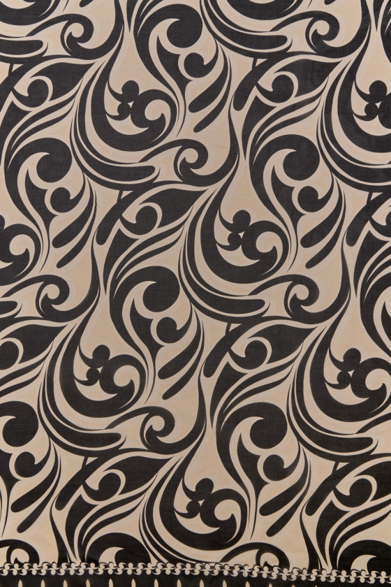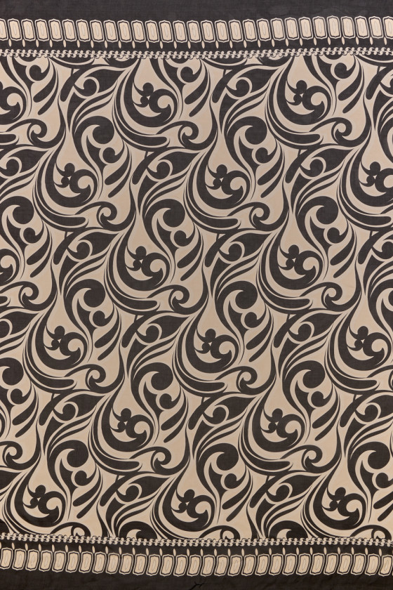 Itališkas viskozės šifonas su natūralaus šilko mišiniu juodos spalvos. Labai įdomus didelių, banguotų raštų motyvas šviesiai smėlio spalvos. Audinys išilgai abiejų kraštų yra baigtas dekoratyvinėmis 15 cm ir 25 cm pločio sienomis - mes siuvame jį apskritimu. Audinys yra plonas, skaidrus, lengvas ir erdvus, jis puikiai tinka, todėl puikiai tinka vasaros suknelės, palaidinės ar skaros siuvimui. Fantastiškas pasiūlymas originalių, natūralių audinių gerbėjams.