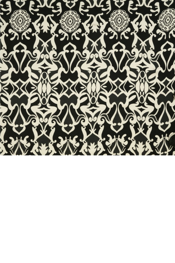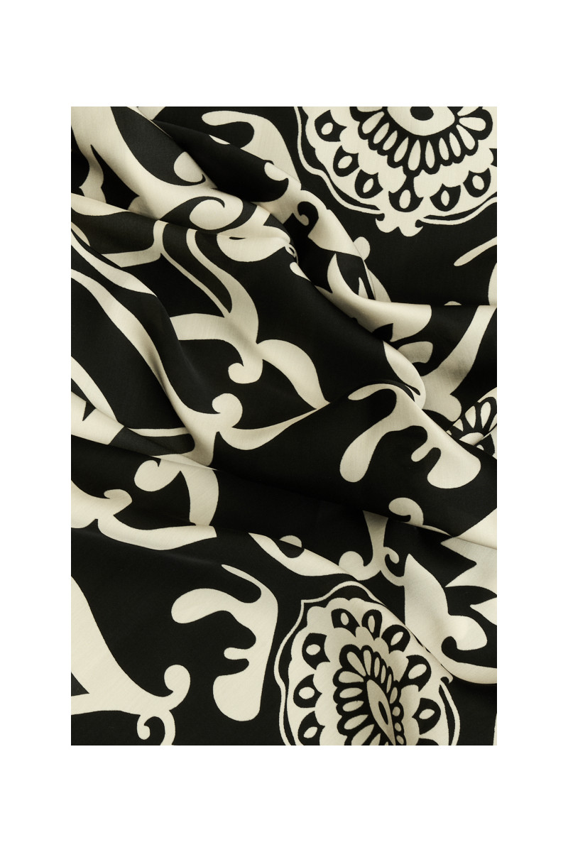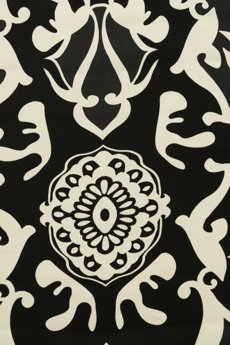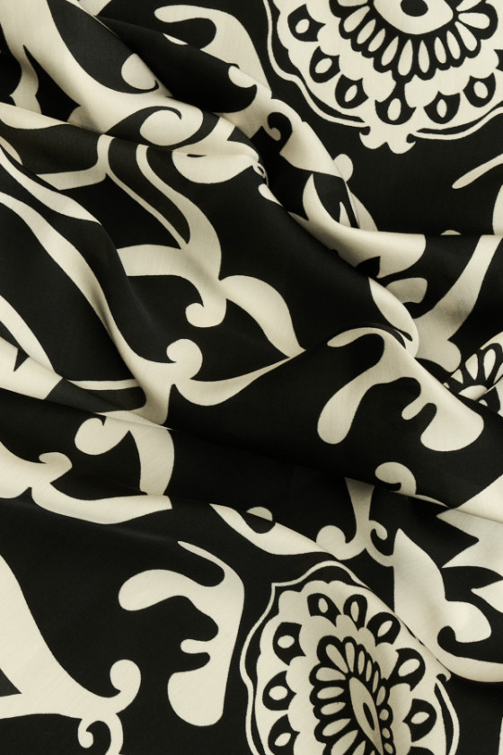 Itališkas viskozės satinas kupone, kurio matmenys yra 95 cm x 135 cm. Tankiai išdėstytas rytietiškas modelis šviesiai smėlio spalvos juodame fone, kuponas baigiamas rozetėmis. Audinys yra neelastingas, tekantis, subtilus liesti, minkštas ir gražiai priglunda. Satino pynimas suteikia jam kilnų blizgesį. Fantastiškas pasiūlymas žmonėms, ieškantiems unikalių ir įdomių medžiagų marškiniams, sijonams, suknelėms ar šalikams.