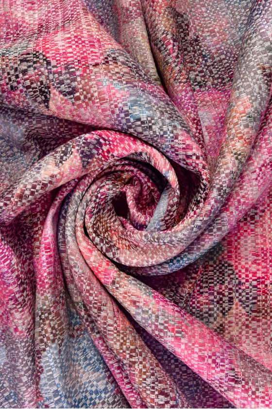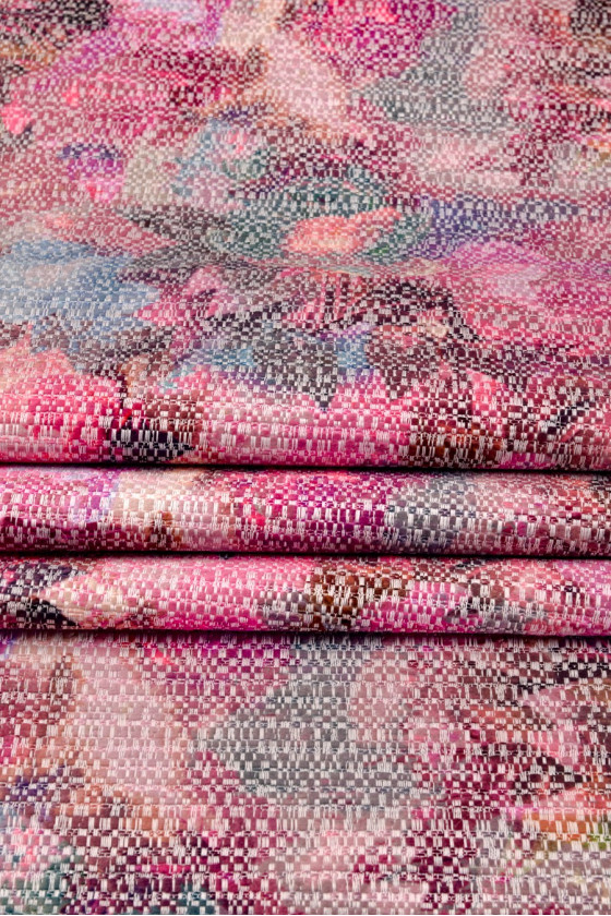 Itališkas žakardo kostiumo audinys su storu, aiškiu pynimu. Labai įspūdingas didelių, dažytų gėlių modelis. Dominuojančios spalvos čia yra fuksija ir rožinė su mėlynos, žalios ir bordo elementais. Puikus pasiūlymas siūti elegantišką kostiumą, suknelę, sijoną. Audinys taip pat gali būti naudojamas dekoravimui.